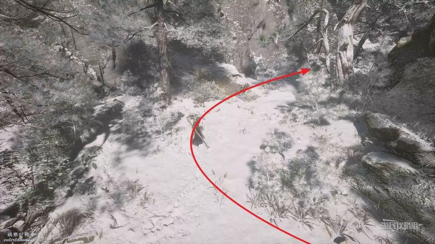 按照上圖箭頭往下跳兩層後,應該落在一條山路上,然後按照上圖箭頭表示方向前進,可以看到前方有一堆雕像站在路邊。
