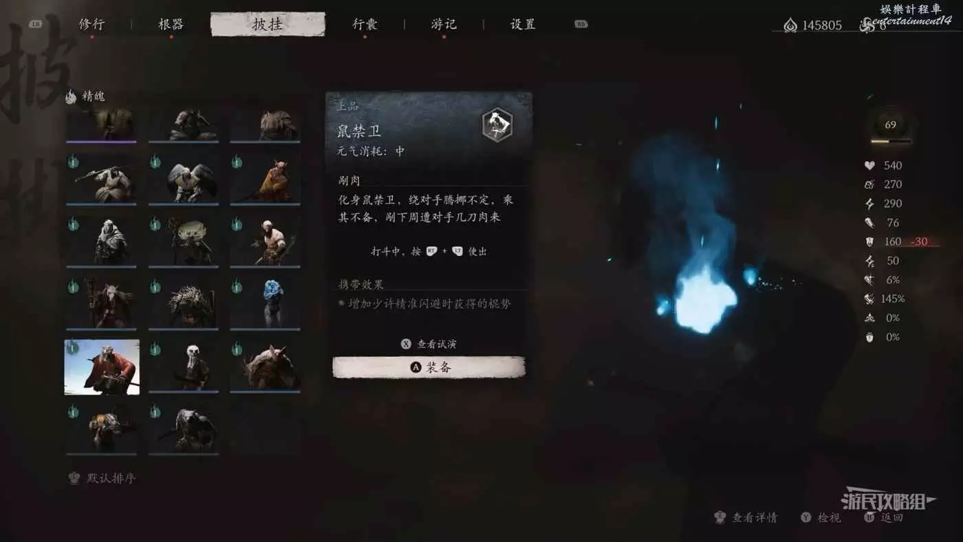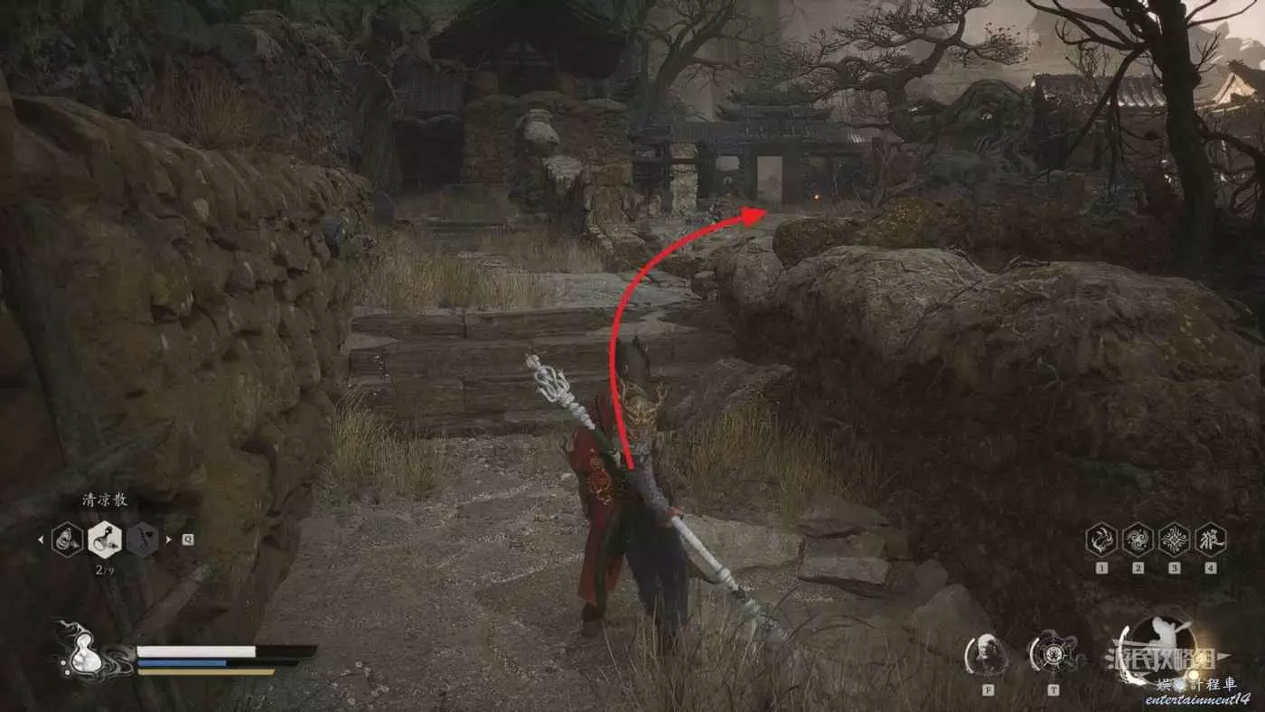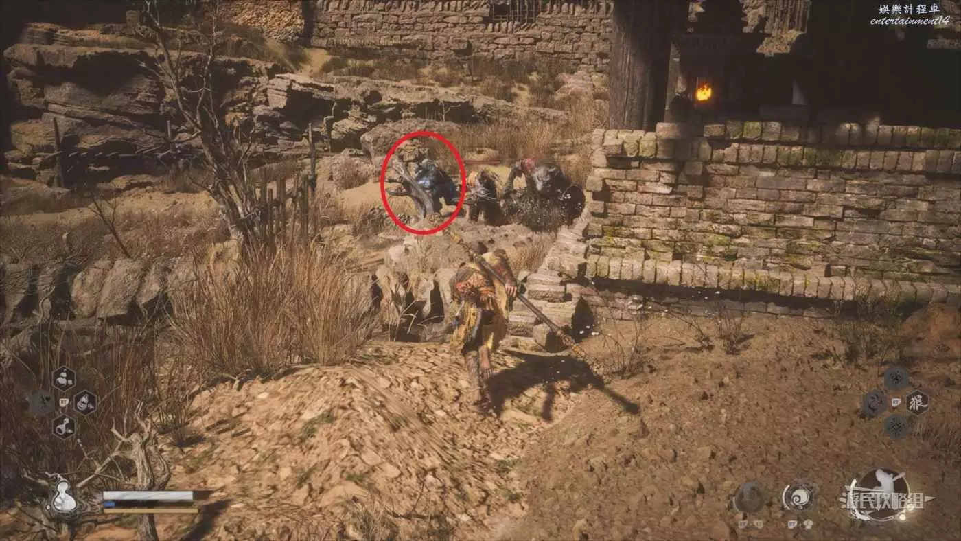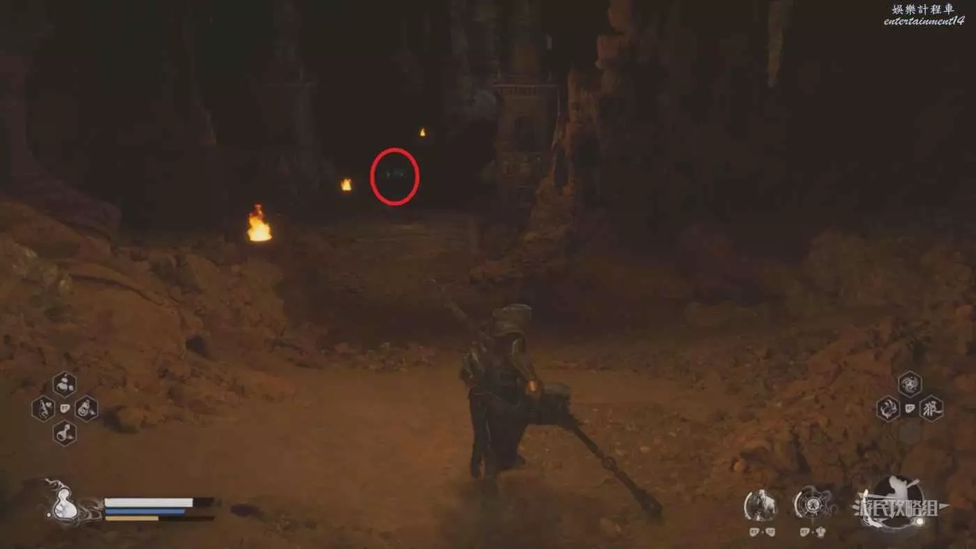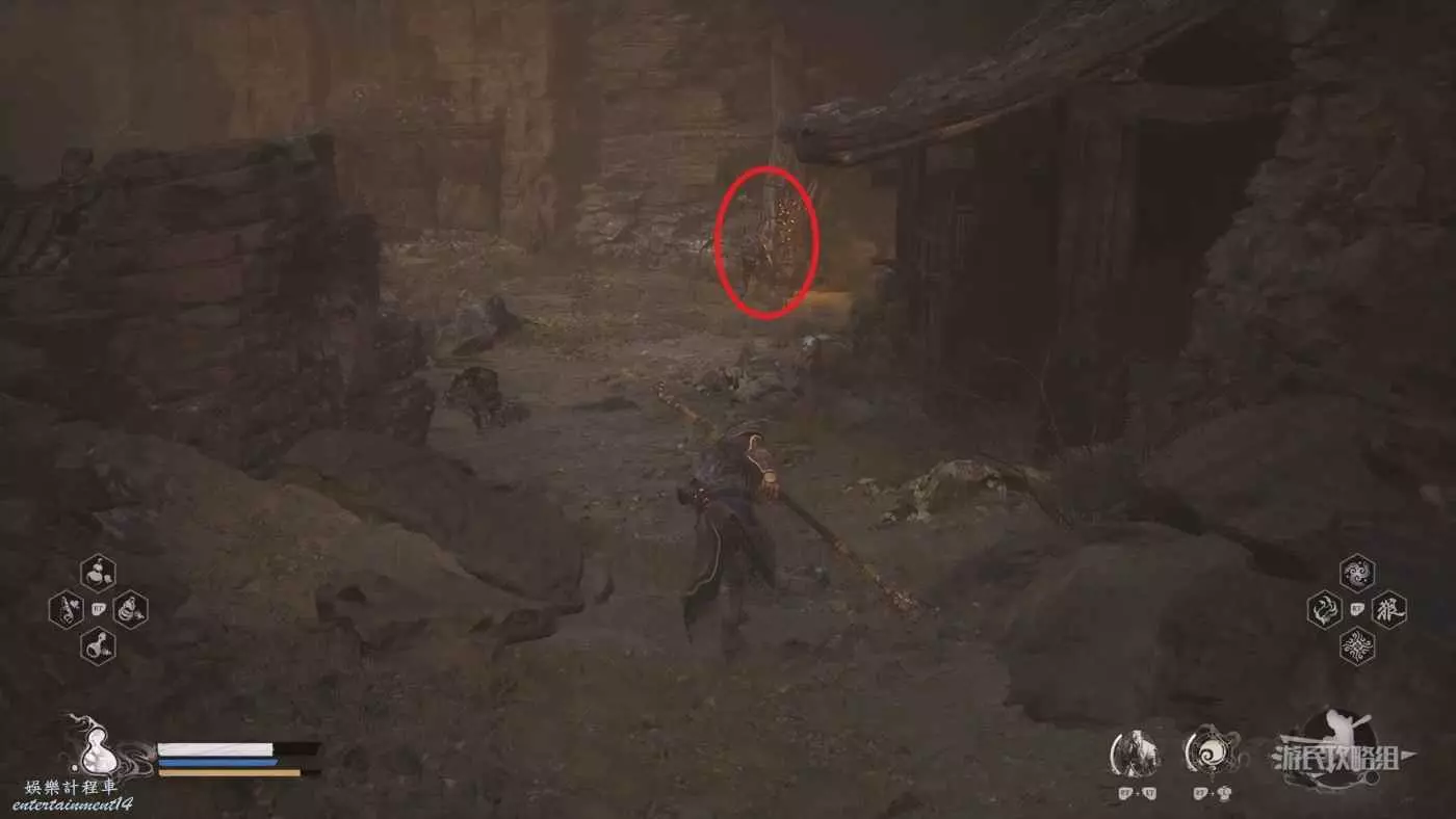 沿著牆壁繼續往前走,靠近右側村莊大門時,會有三隻紅衣服的鼠禁衛從房頂上往下跳,擊敗其中冒藍火的鼠禁衛即可獲得精魄。