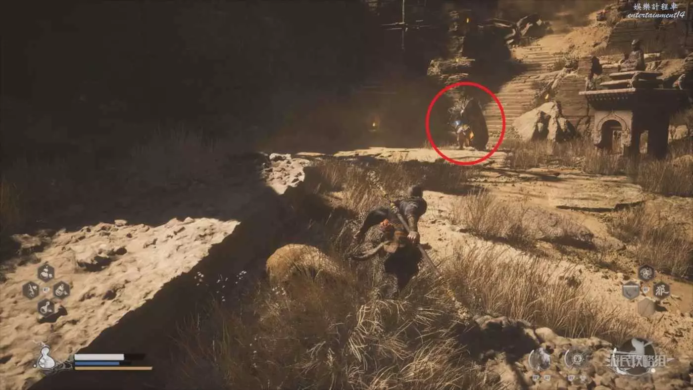 從第二回【黃風嶺-挾魂崖-枕石坪】土地廟出發,面對土地廟往右走上台階,在巨大的沙瀑下方一層可以看到冒藍光的骨悚然,擊敗獲得精魄。