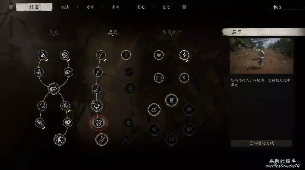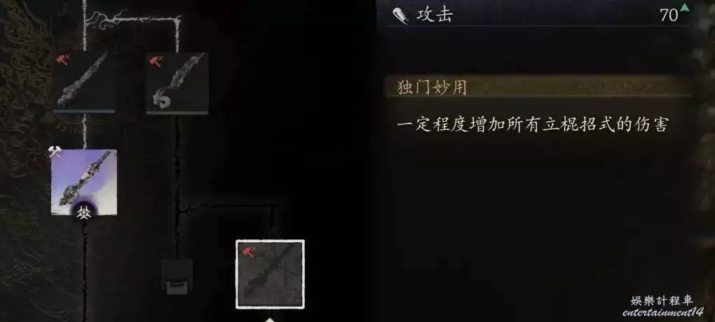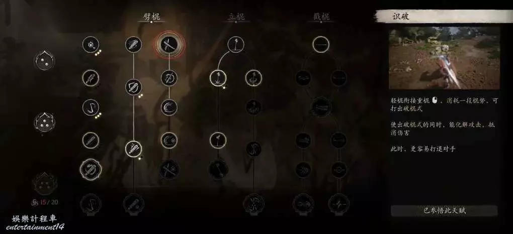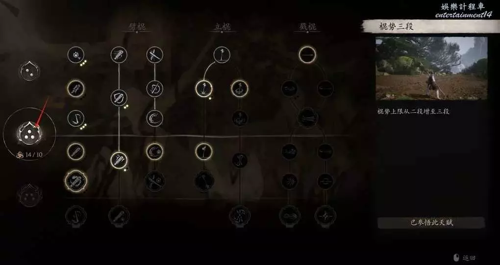 棍法主點的劈棍,其他兩種感覺使用場景不太廣,就沒去專門投入深層加點。但要注意,在棍法上,請務必要投入10個技能點,解鎖棍式三段!