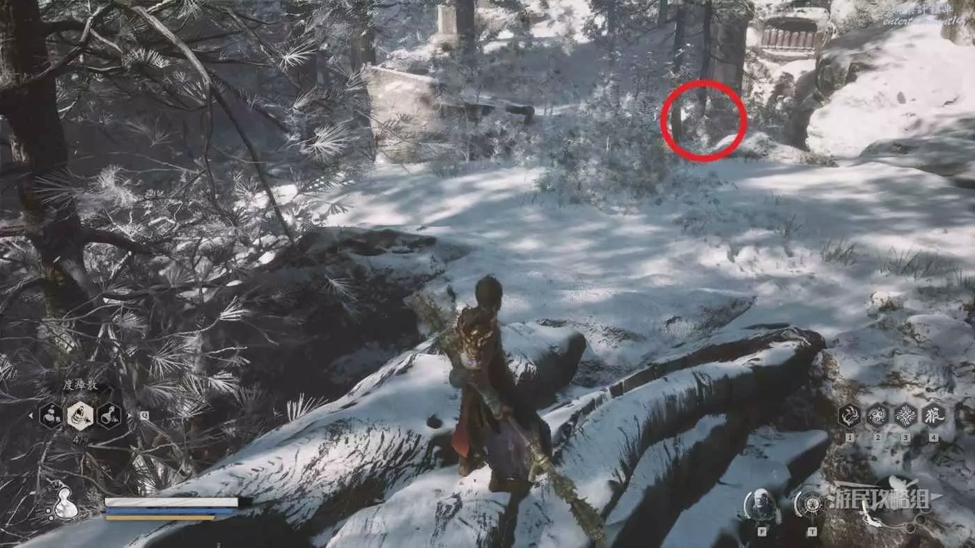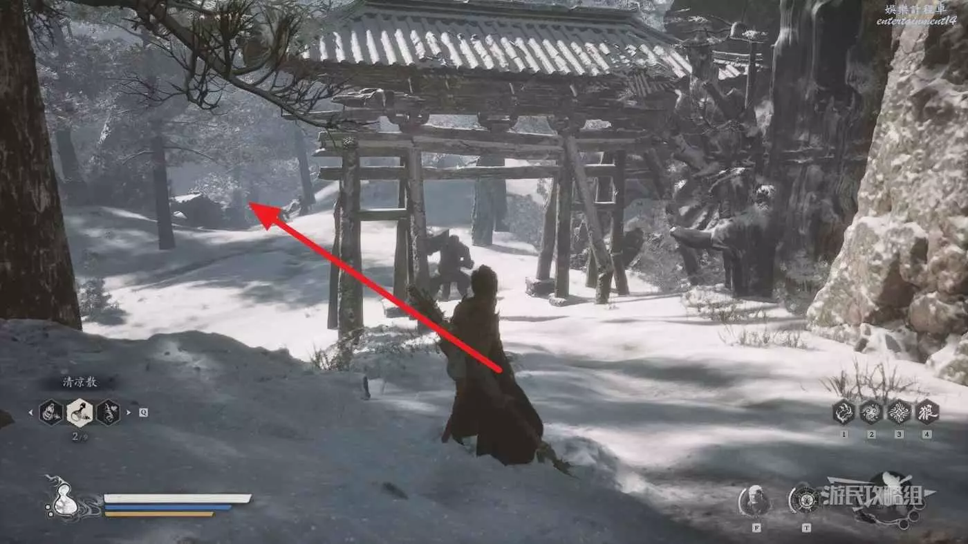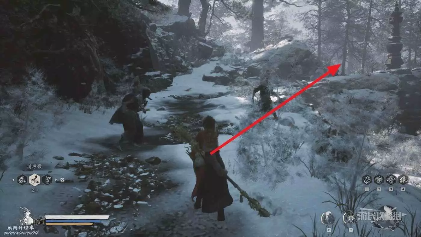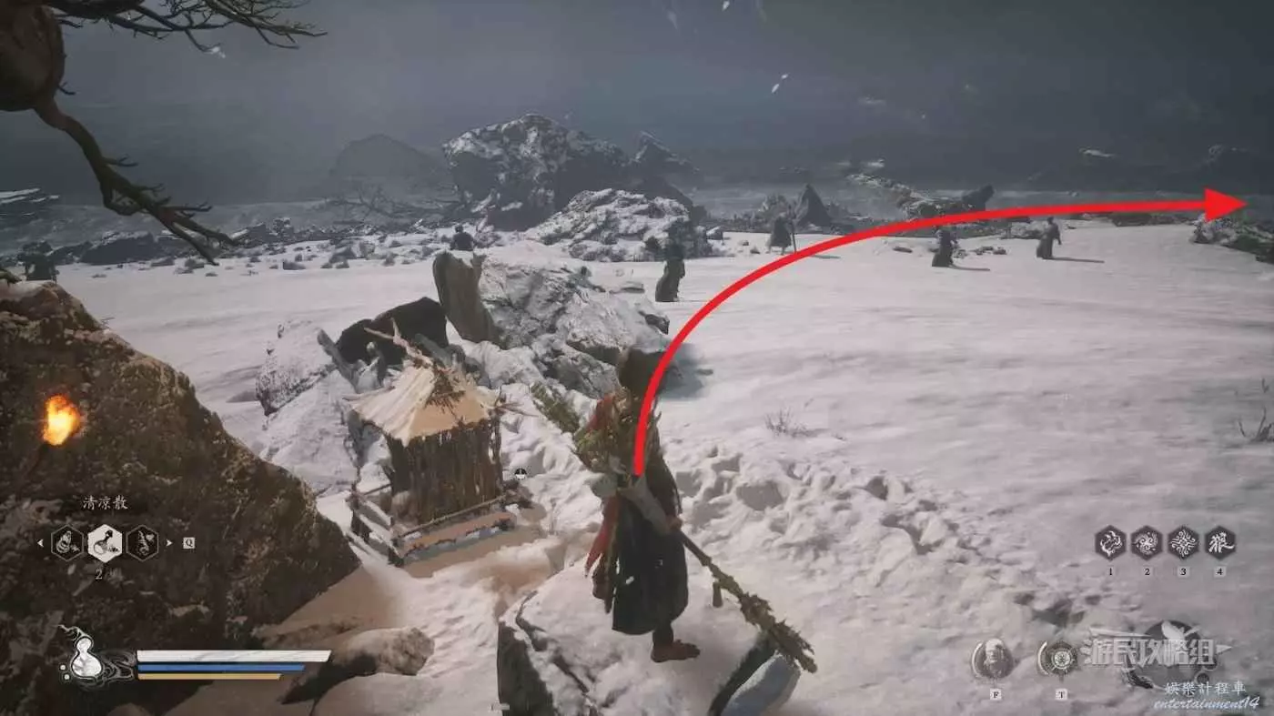 走到頭可以看到懸崖,懸崖邊有3個雪僵屍,其中2個是雕像,1個是真的,擊敗敵人之後從懸崖往下跳。