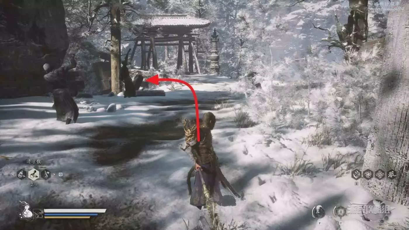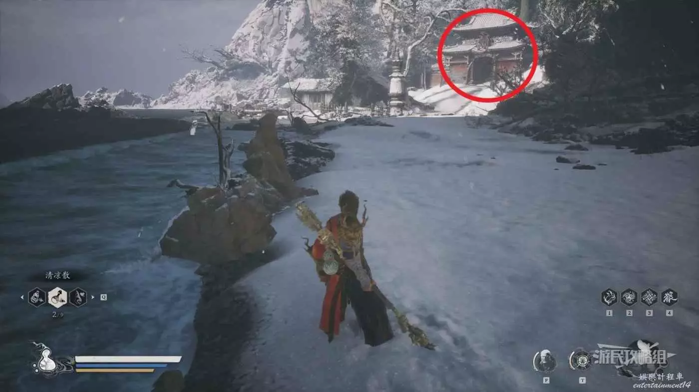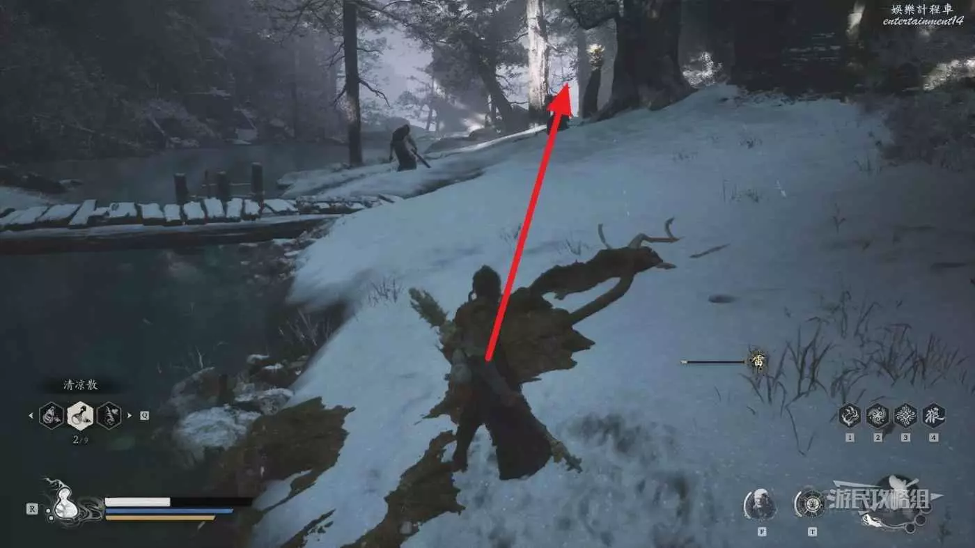 走到頭在海邊會遇到辰龍,翠笠武師就在辰龍所在位置繼續往岸邊進入雪地上的大門之後。