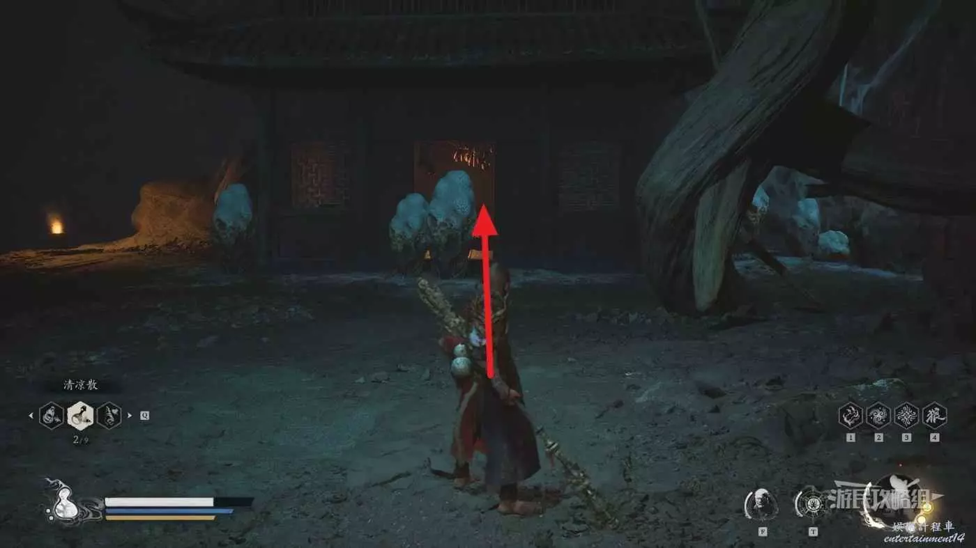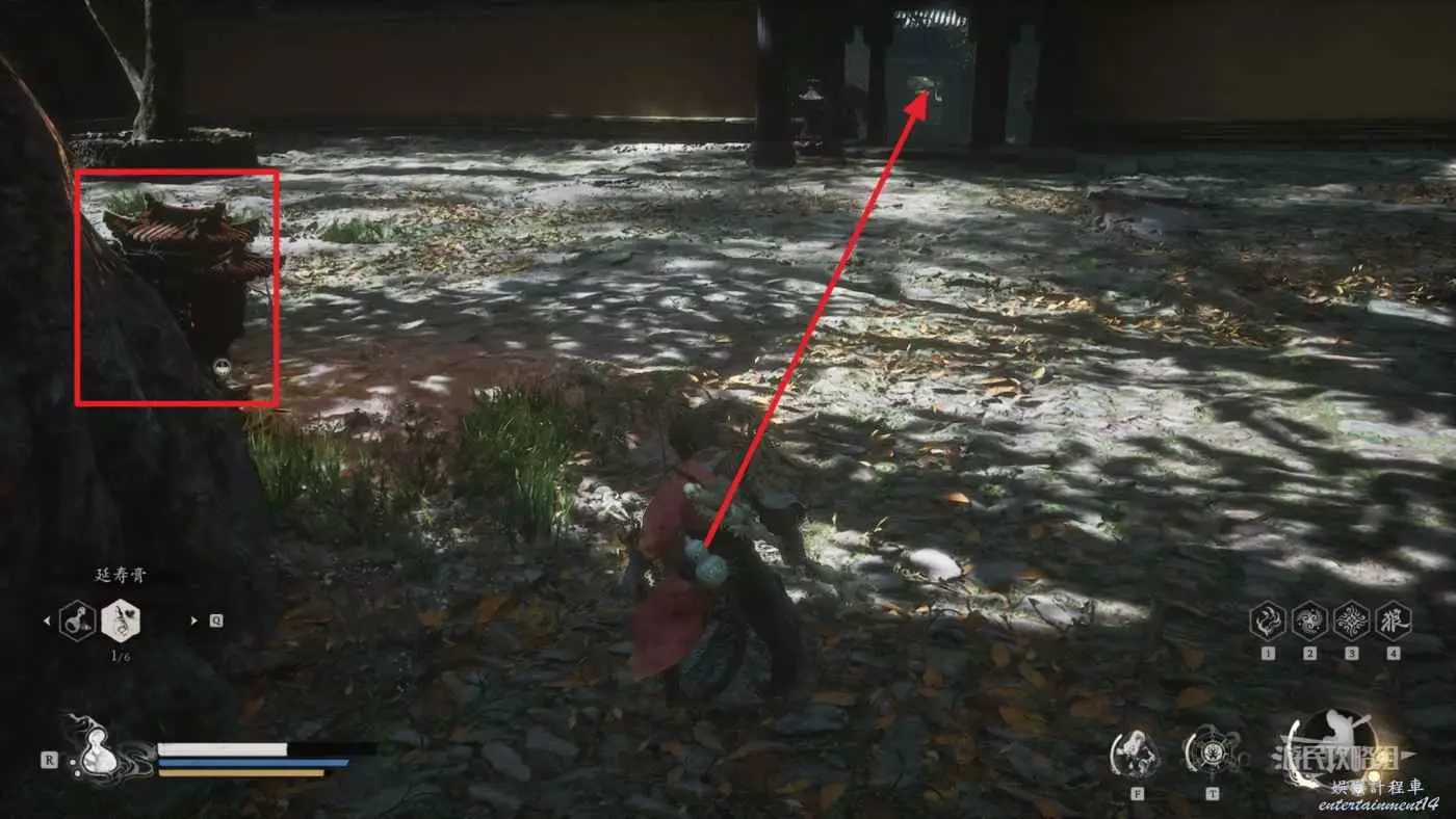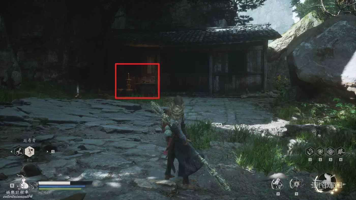 到達樹附近之後,參考下圖,樹右側有個房子,房子和後面石頭之間有一條樓梯,走樓梯往上。