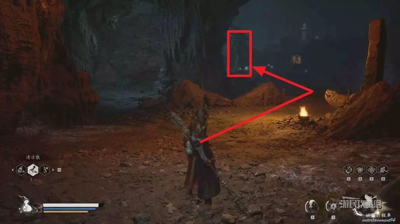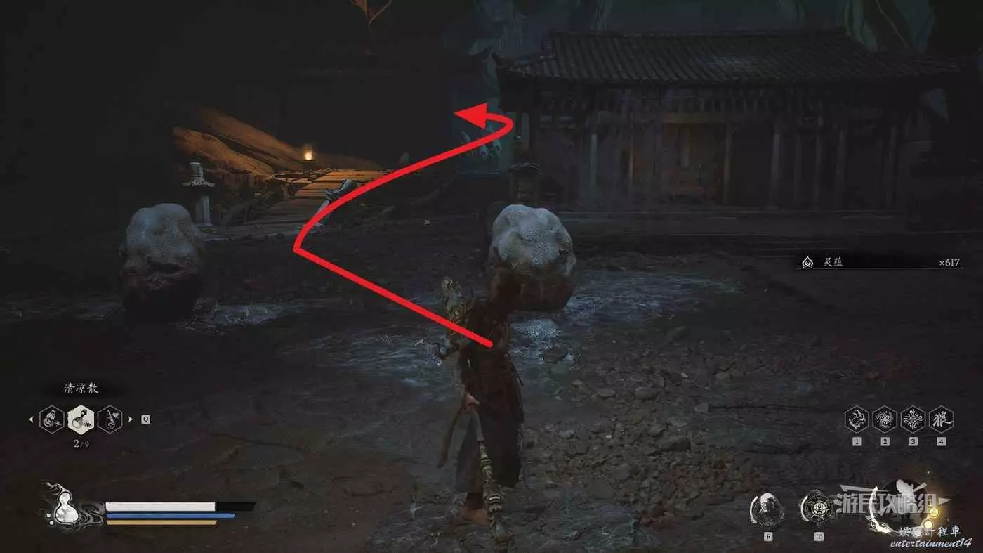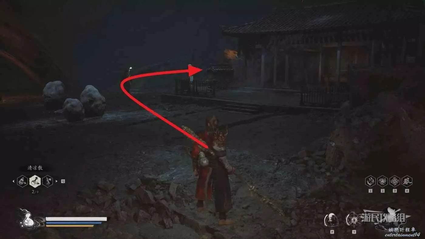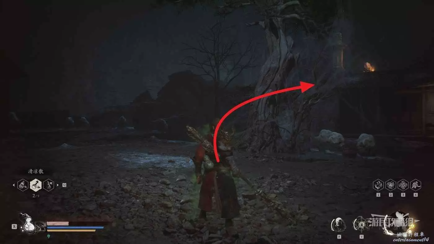 到達樹附近之後,參考下圖,樹右側有個房子,房子和後面石頭之間有一條樓梯,走樓梯往上。