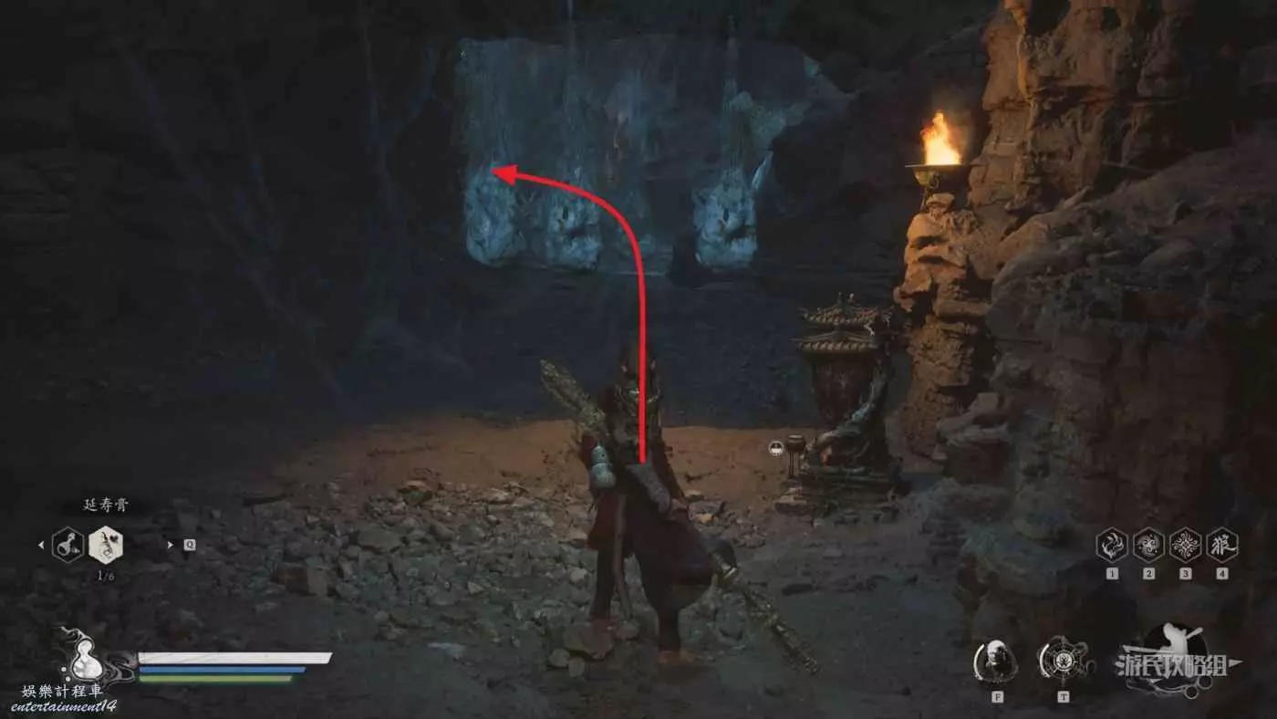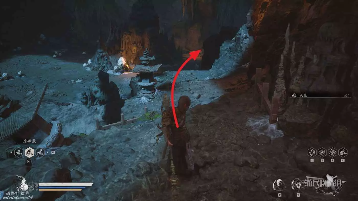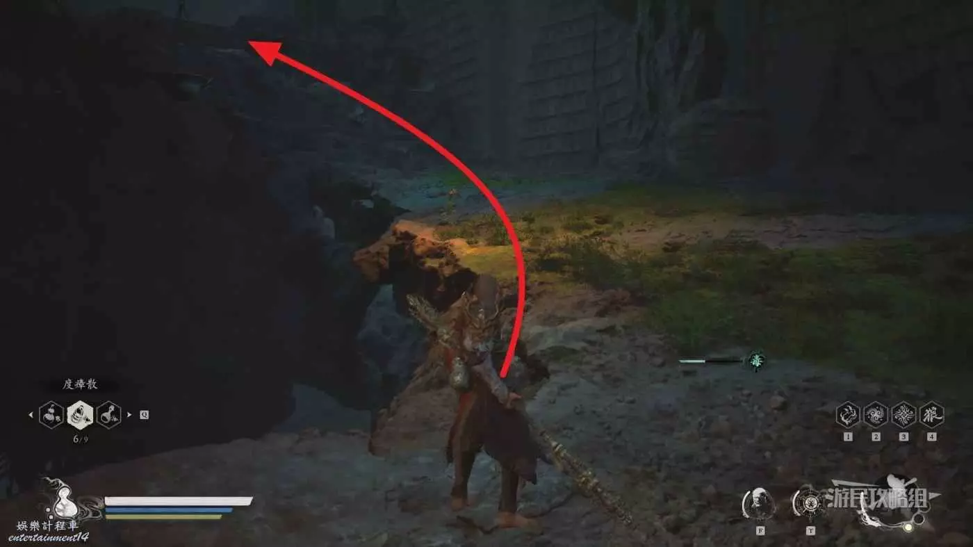 從第四回【盤絲洞-上層】土地廟出發,走土地廟正後方的斜坡往上,然後沿路往下,貼著右側岩壁走。