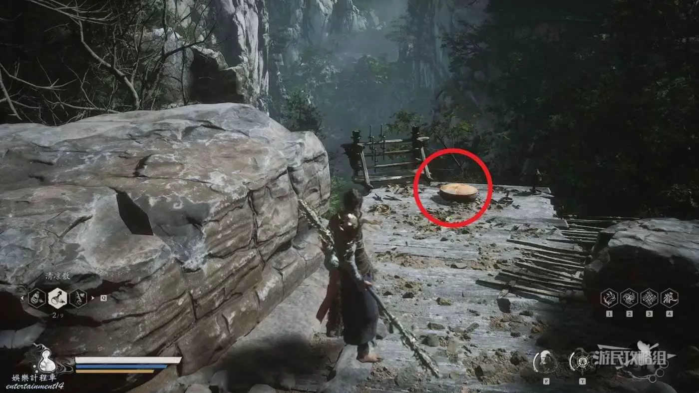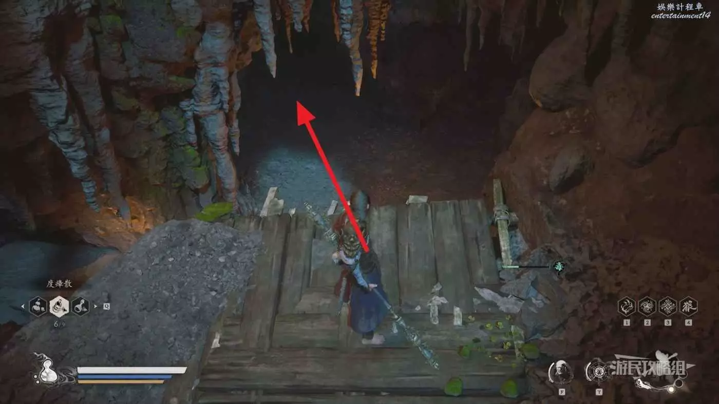 走下斜坡之後,往右邊懸崖邊看,找到一塊木板,從木板處往下跳。