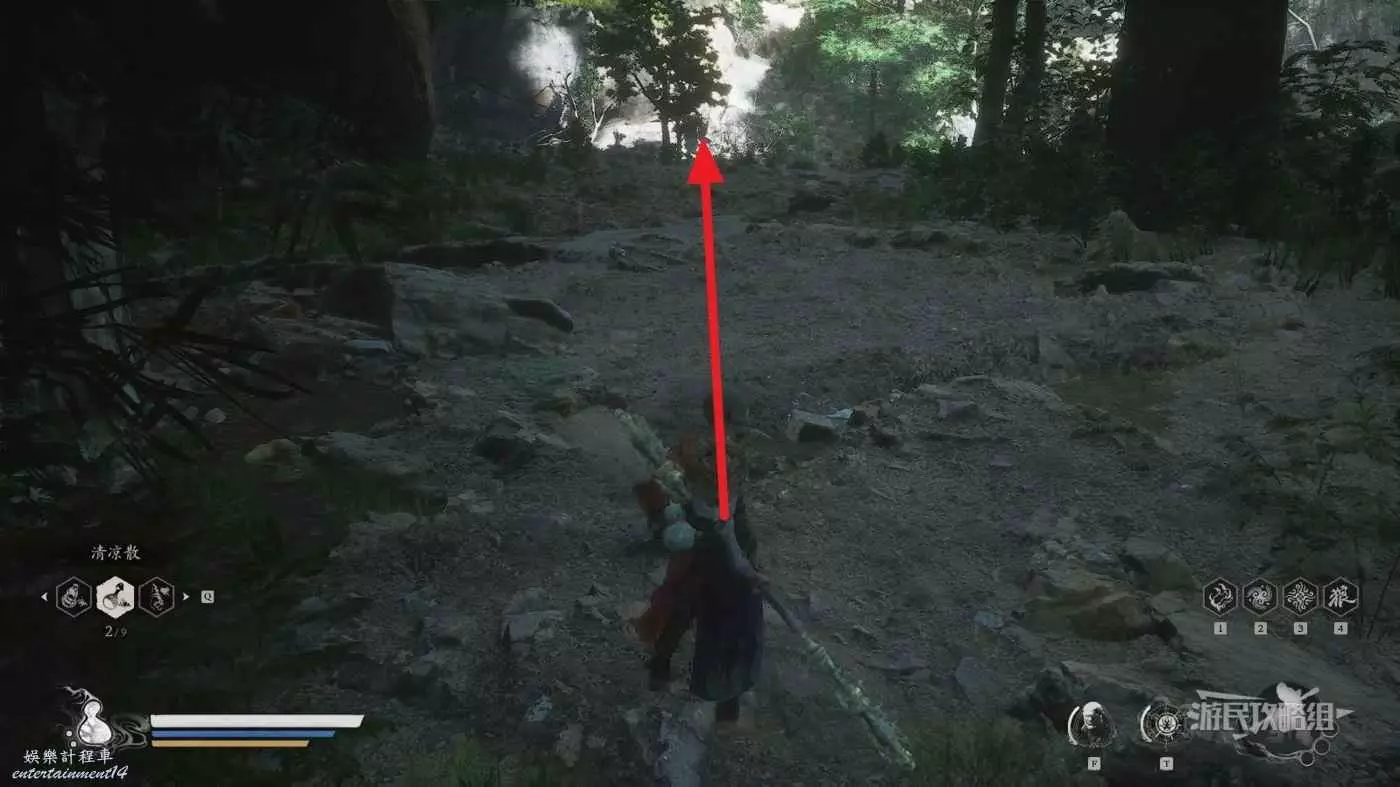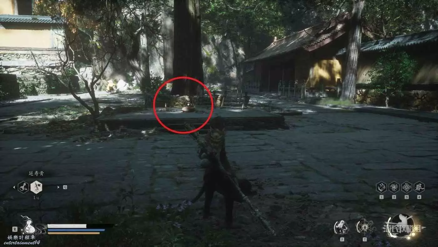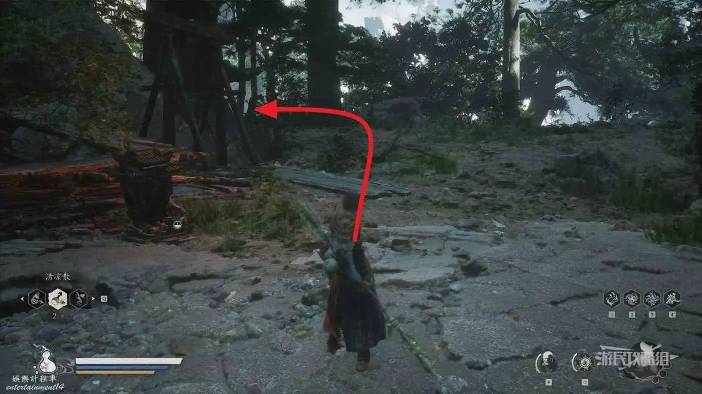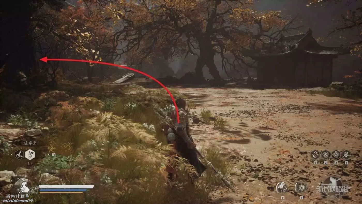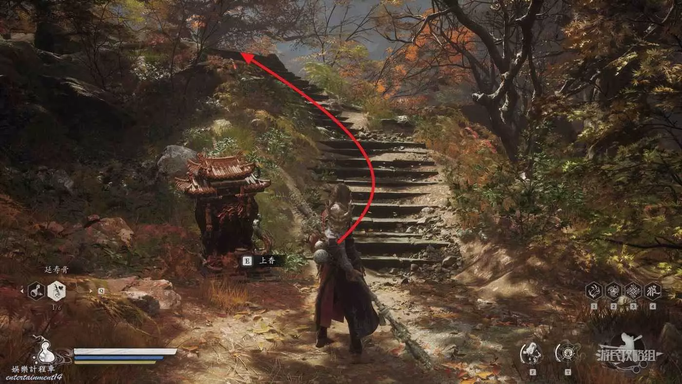 到達樹附近之後,參考下圖,樹右側有個房子,房子和後面石頭之間有一條樓梯,走樓梯往上。