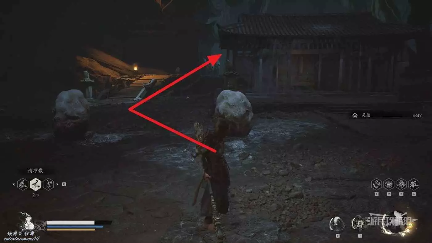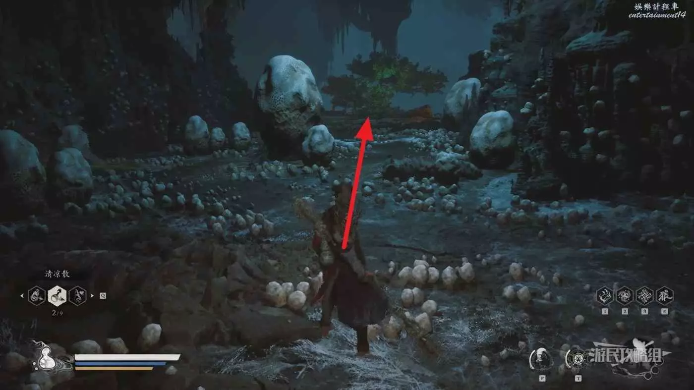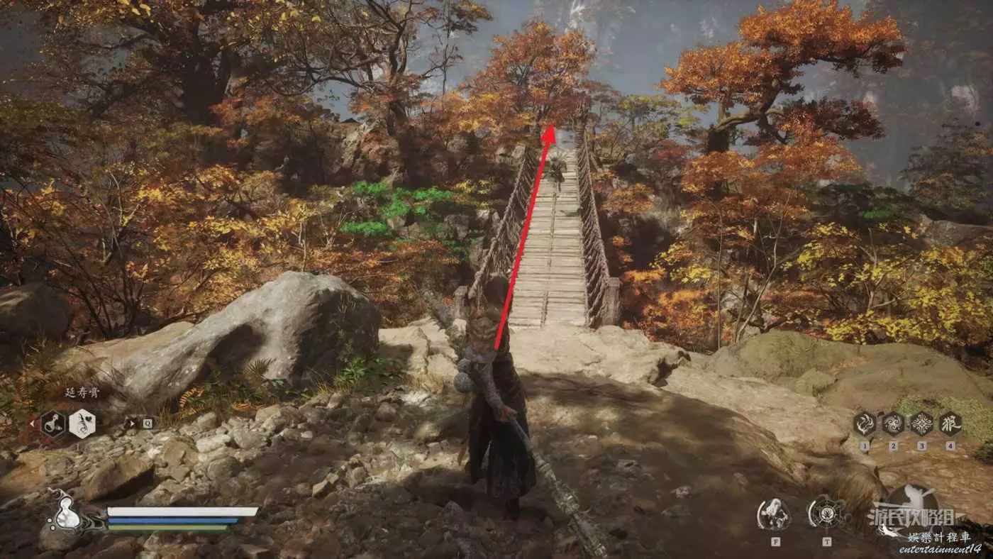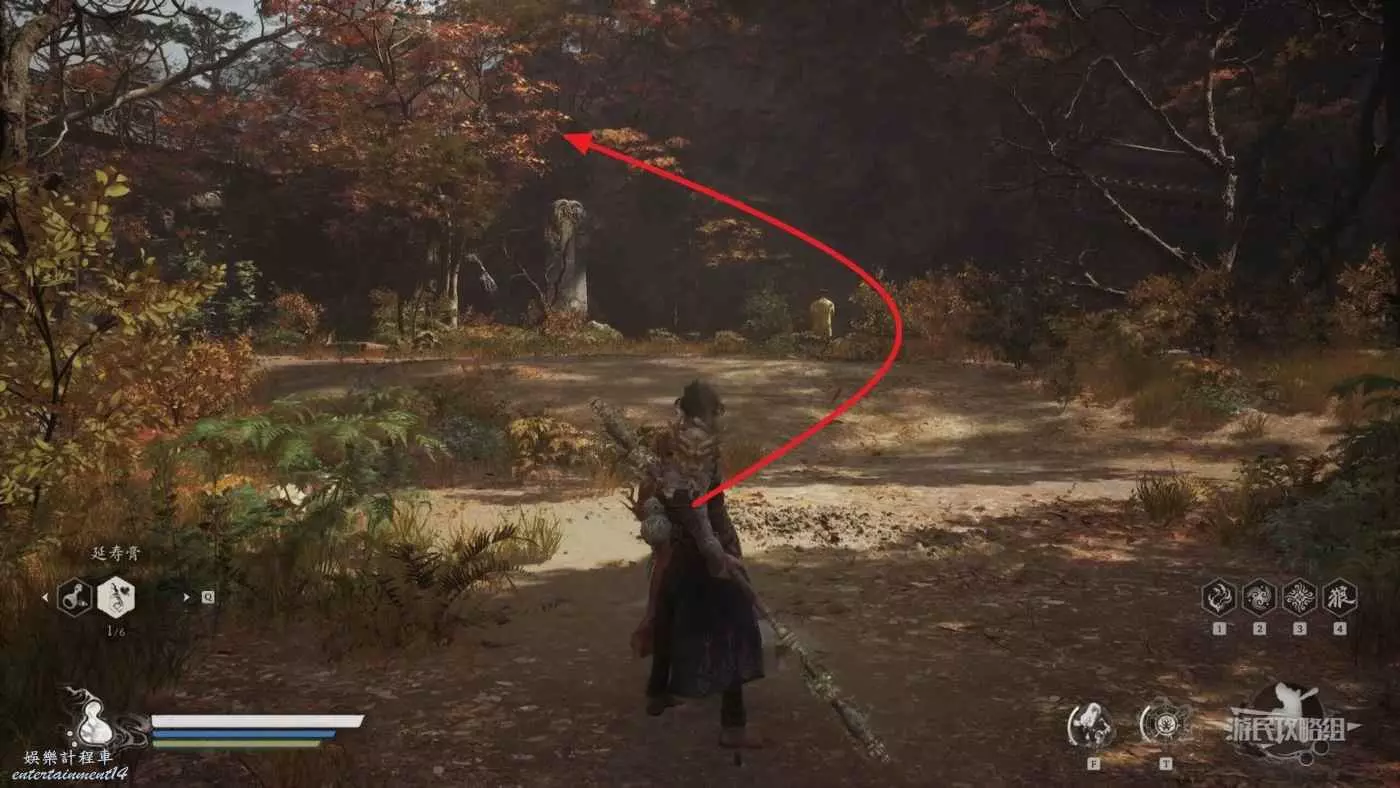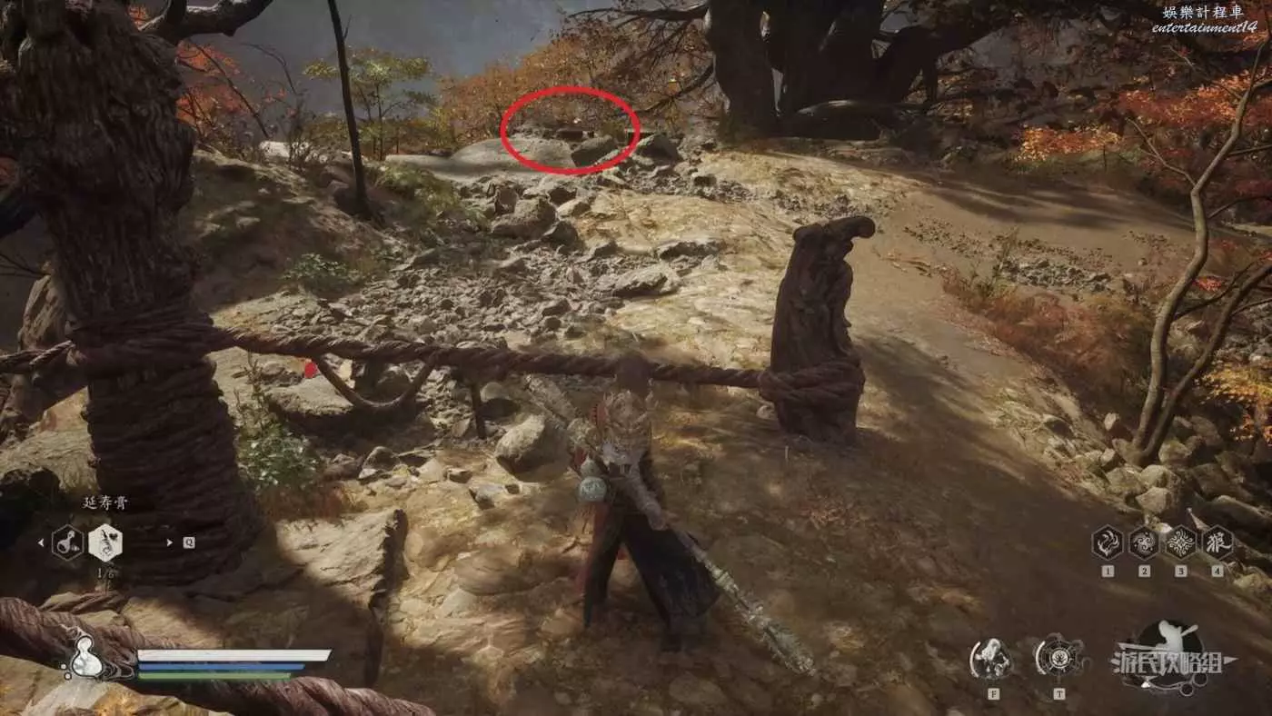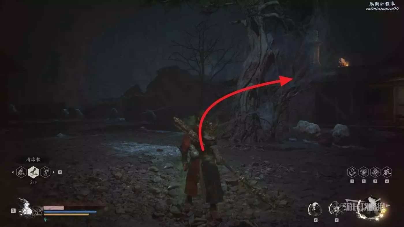 到達樹附近之後,參考下圖,樹右側有個房子,房子和後面石頭之間有一條樓梯,走樓梯往上。