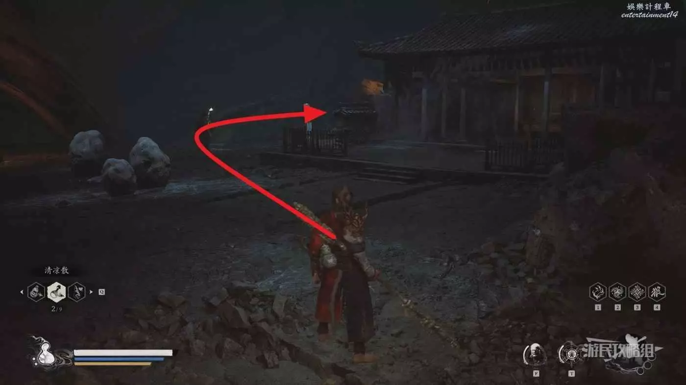 過橋來到下一片區域,左側有座房子,右邊是貼著紫色符咒的塔,走中間的路繼續前進。