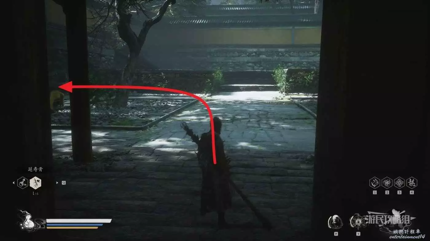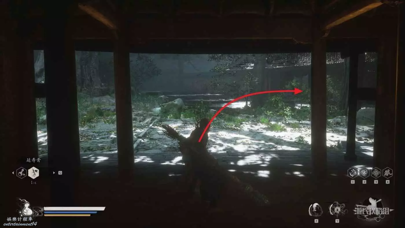 沿路走到頭在右側可以看到一個木板,從木板處往下跳,走樓梯上坡往前方建築中間的樹方向走。