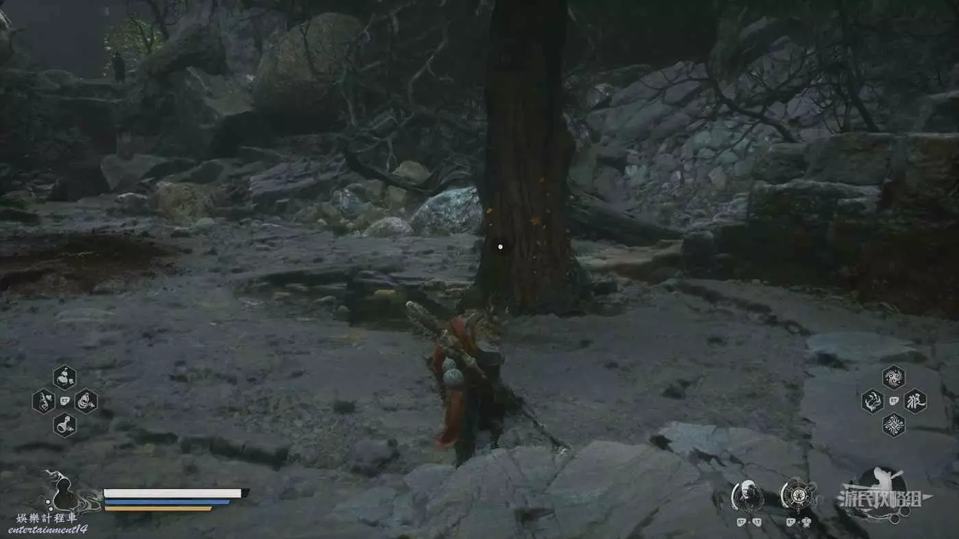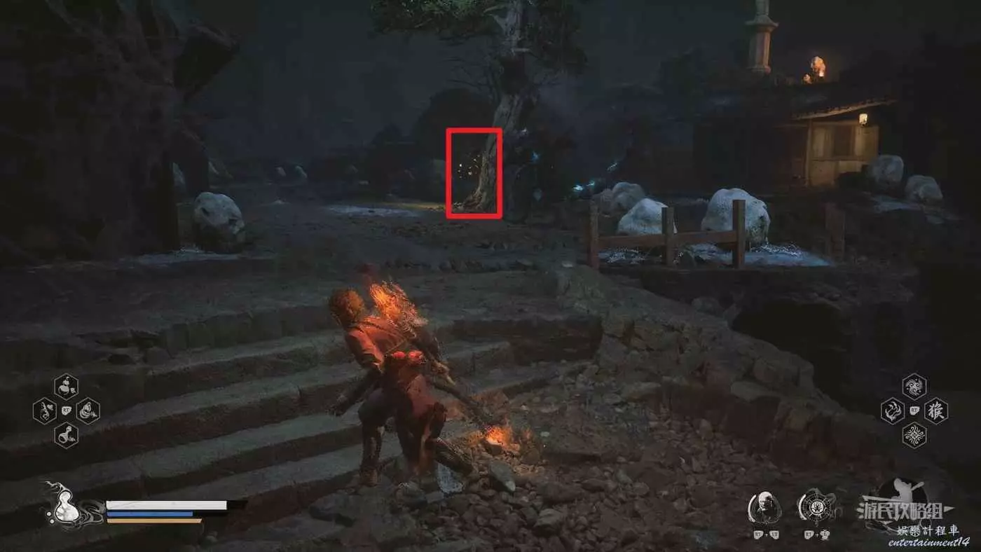 沿路走到頭在右側可以看到一個木板,從木板處往下跳,走樓梯上坡往前方建築中間的樹方向走。