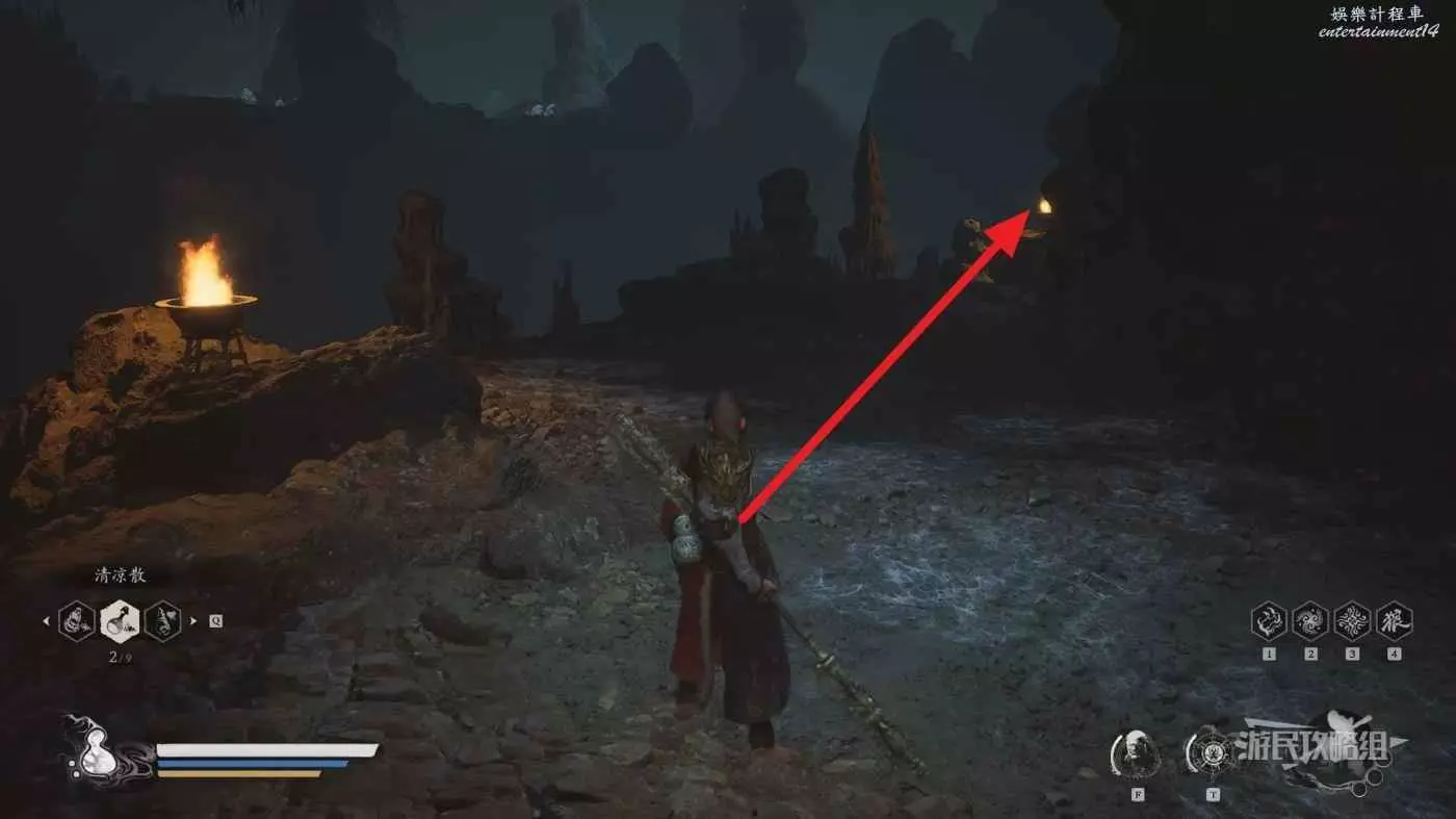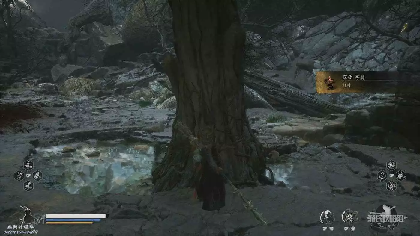穿過獨木橋後,沿著唯一的路往前走離開山洞,可以看到一個敵人,不要轉彎,繼續直著走到懸崖邊即可看到落伽香藤。