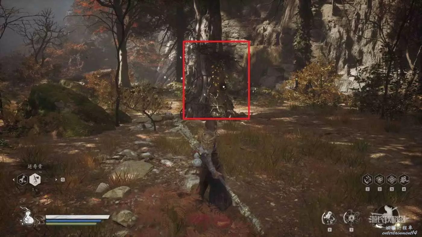 在第四回【隱·紫雲山-千花谷】土地廟,面對土地廟往左看可以直接看到一個冒藍光的敵人,敵人背後的樹上就是落伽香藤。