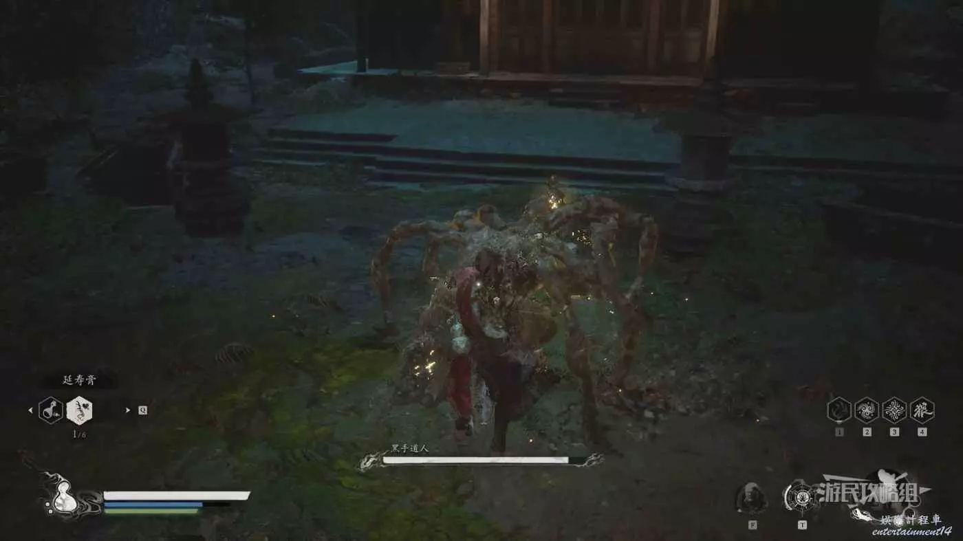 黑手道人施放戳地技能時會說固定台詞:【誰的刀快誰就有理】和【白刀子進紅刀子出】,在觸發這兩句台詞並且看到他像下圖這樣兩把武器都戳入地面,然後停住不動,背上的手臂像蜘蛛腿一樣放在地上時,使用定身術,繞到黑手道人背後造成一定傷害,此時黑手道人的血條就會削減一小段,說明成功砍掉了他的手臂。