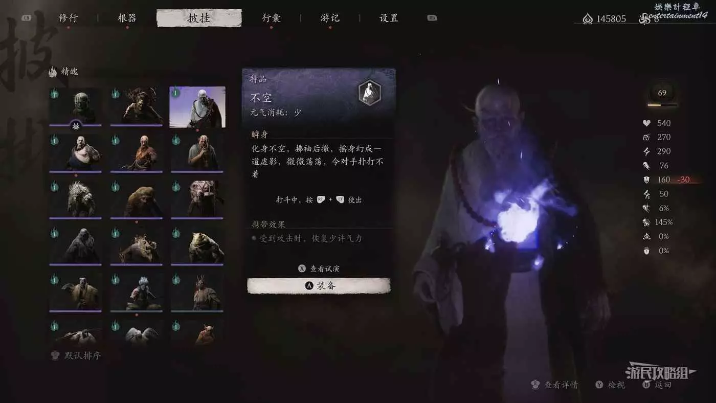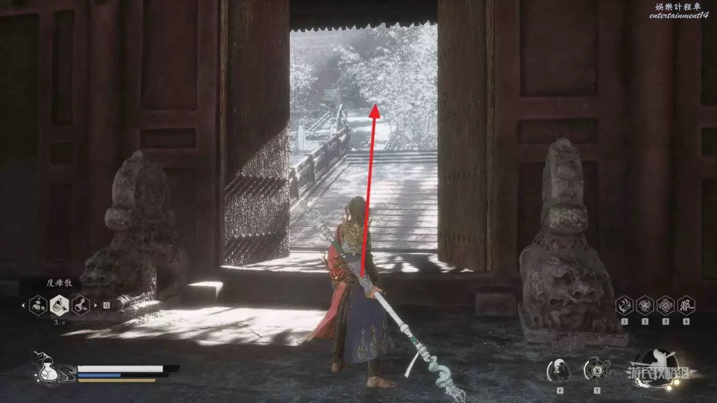 來到二樓的門處,往外看就能看到不空所在的偏殿。打開功能表選擇【行囊】,使用從狐狸那裡獲得的筆,變成狐狸,進入偏殿觸發劇情,然後擊敗BOSS不空。