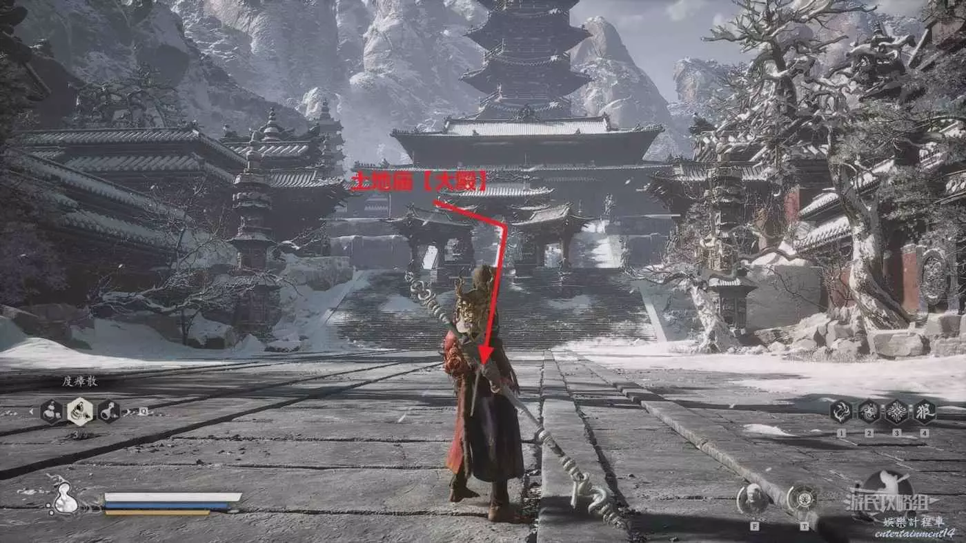 由於小雷音寺中只有兩個土地廟,所以我們這裡不以土地廟為起點,首先來到小雷音寺大殿前的廣場(樓梯下方),下圖箭頭是從土地廟【大殿】往下走。