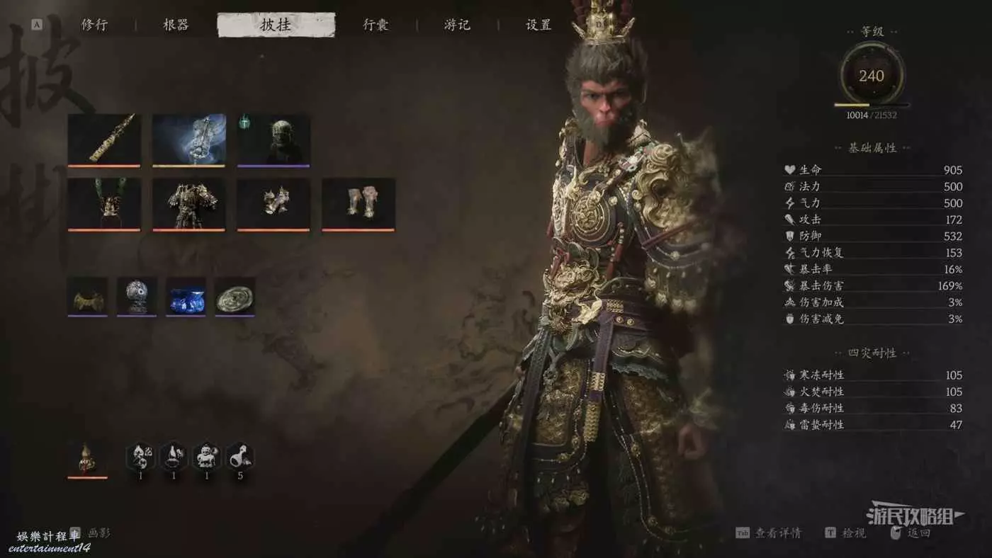 我個人測試用的四周目存檔等級為240級,配裝和加點如下圖所示。
