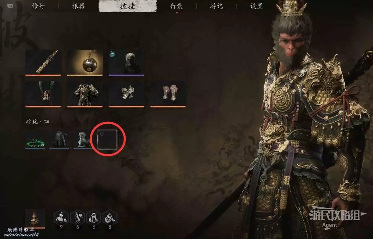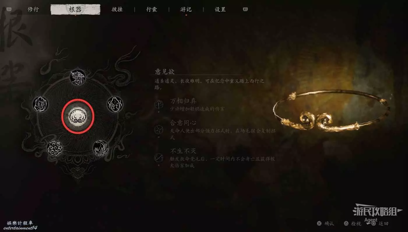 3、進入二周目自動得到第六件根器(中間那個,第六件根器其實是在二郎神那裡,打完二郎神才算集齊全部)。