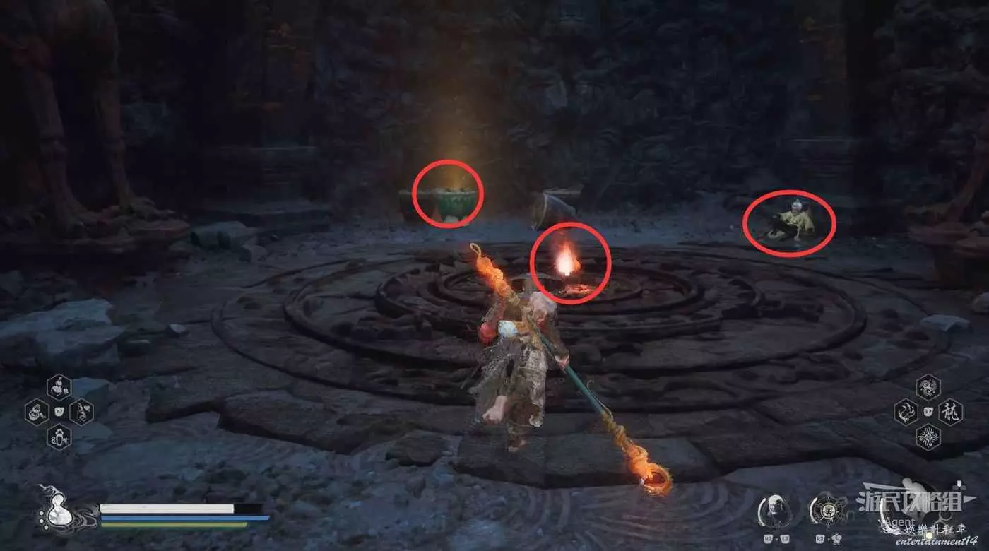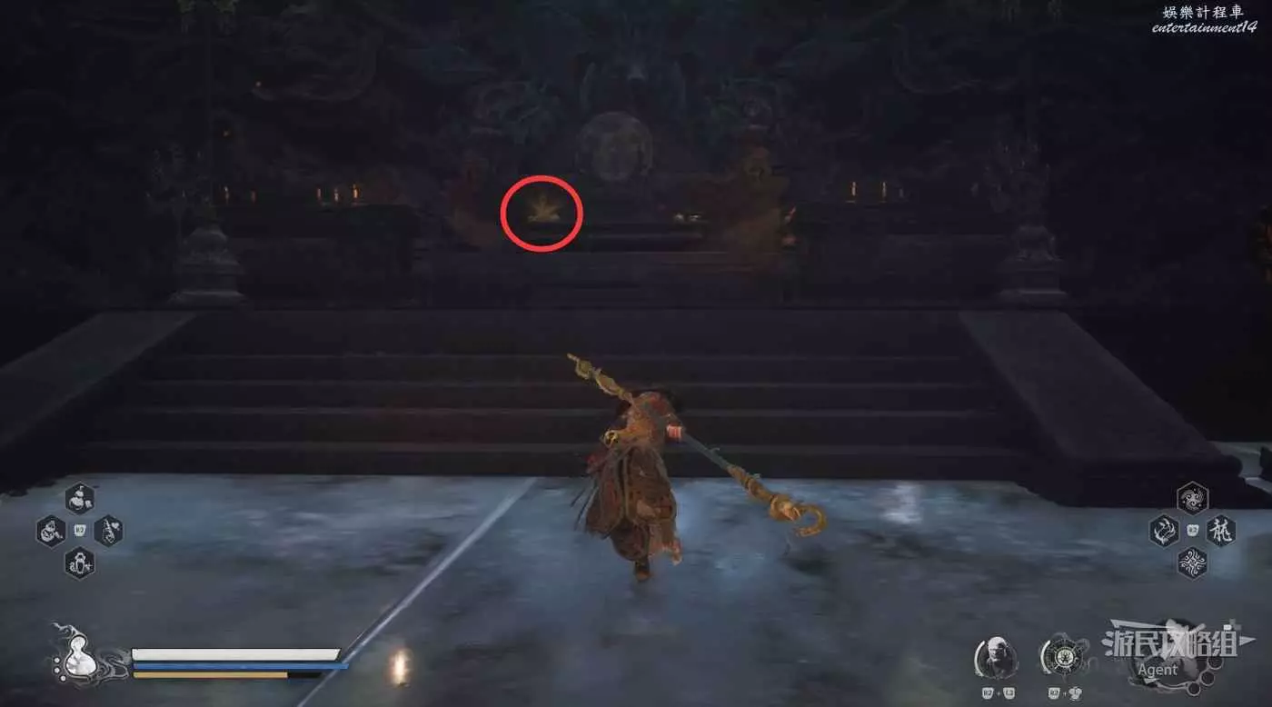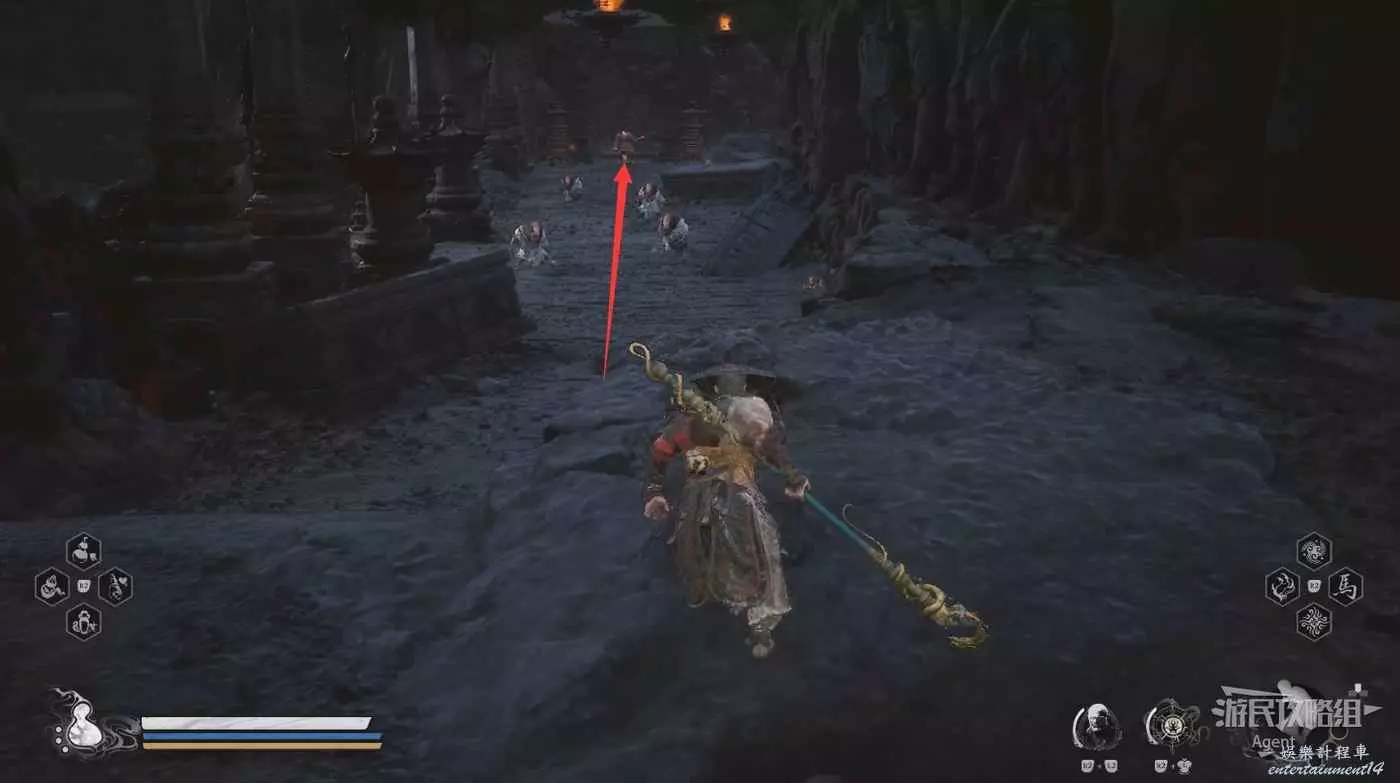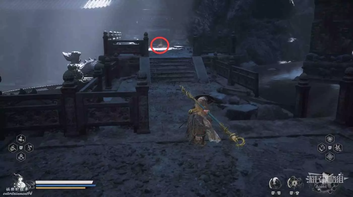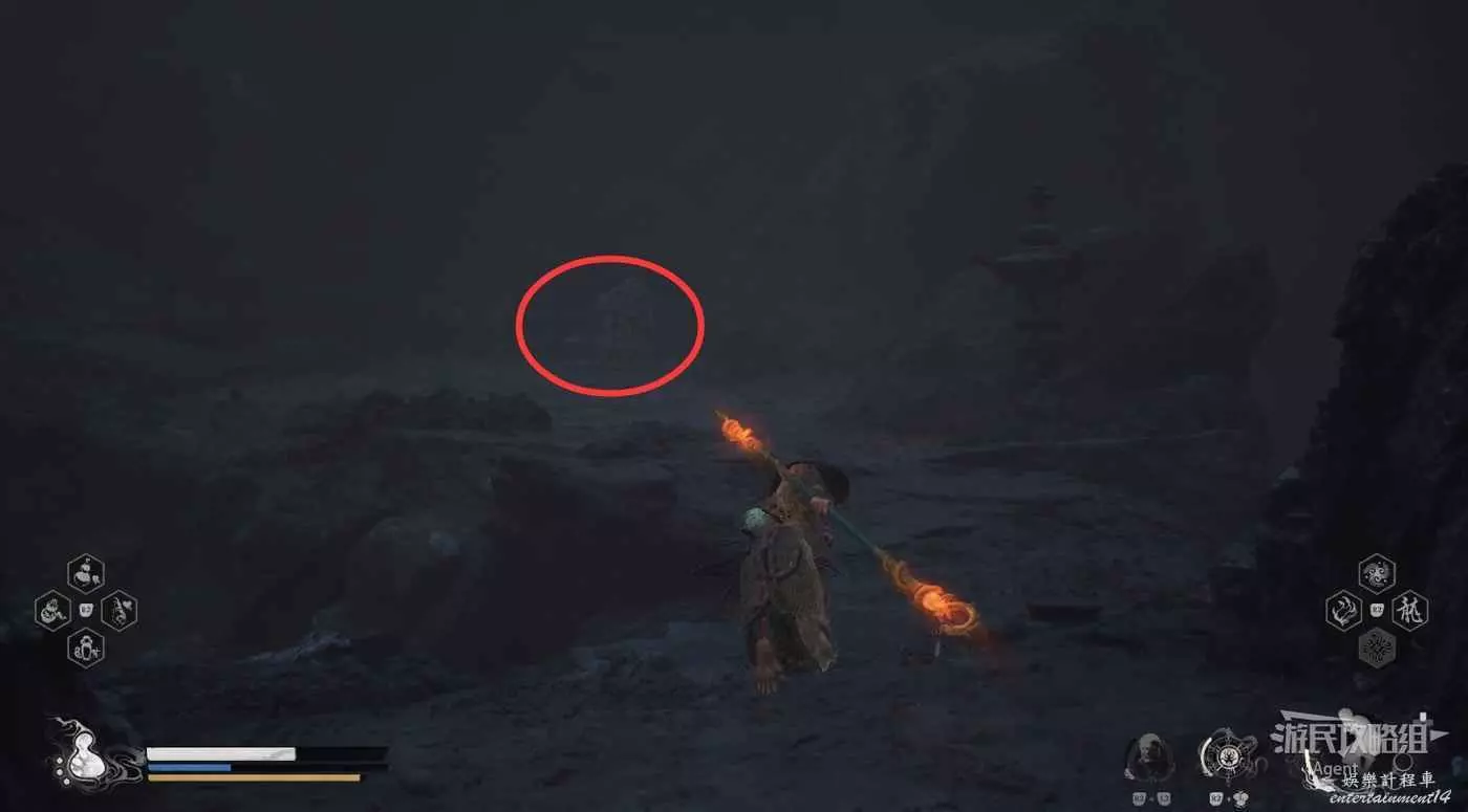 必須先跟著攻略打完前面所有的隱藏關卡,包括第三關的翠笠武師瓜田支線見到彌勒佛,才能進入這最後的隱藏關卡。其實前面幾個隱藏關卡的NPC都是二郎神安排的梅山兄弟,考驗並幫助小猴子獲得制服關底BOSS的法寶或法術的。
