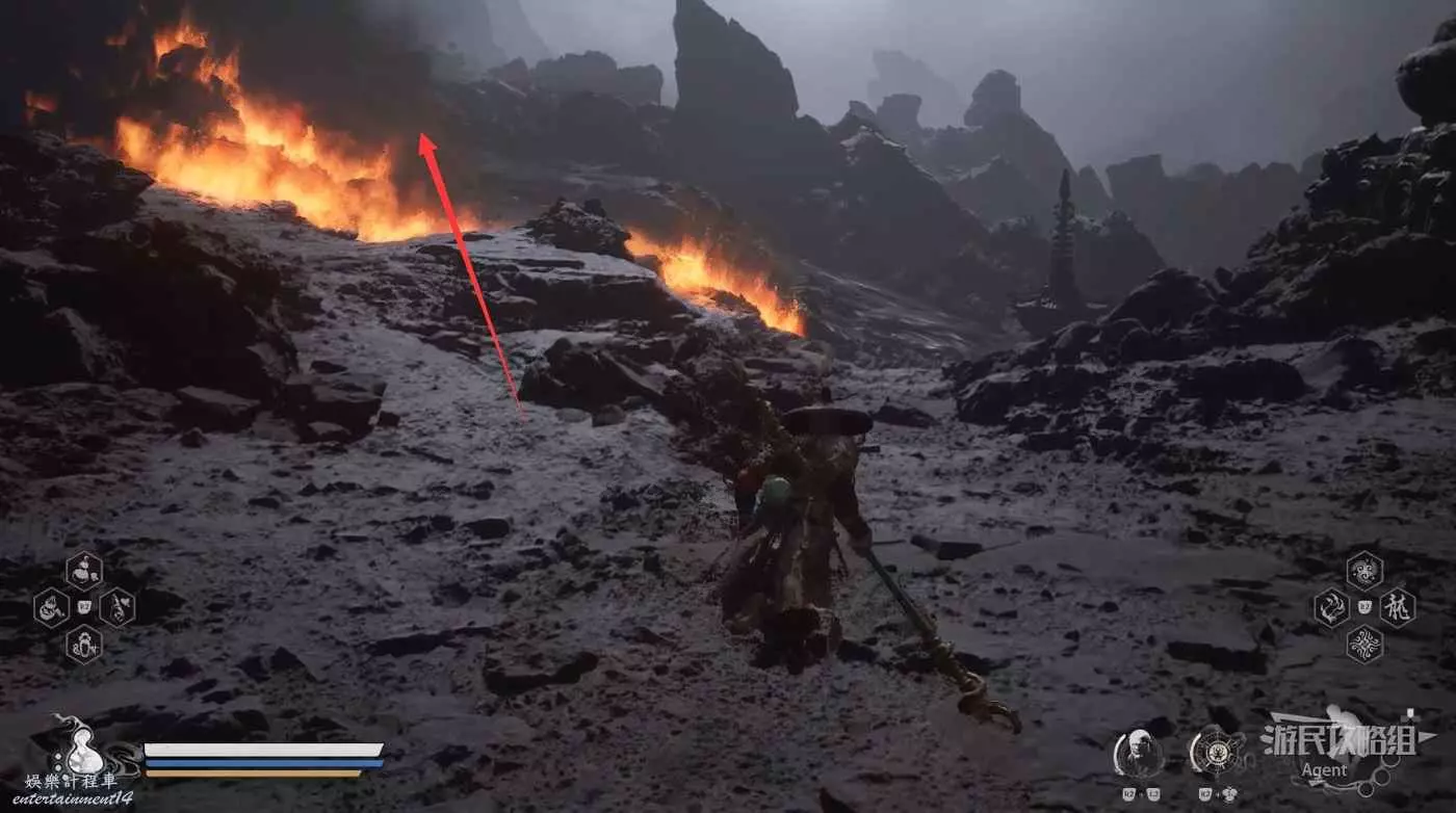 跟隨小狐狸穿過隧道,看到被火擋住的路,等後面芭蕉扇滅火後就能走了,通往隱藏關卡。不過這條路並沒什麼用,因為我們會從另一邊過去。