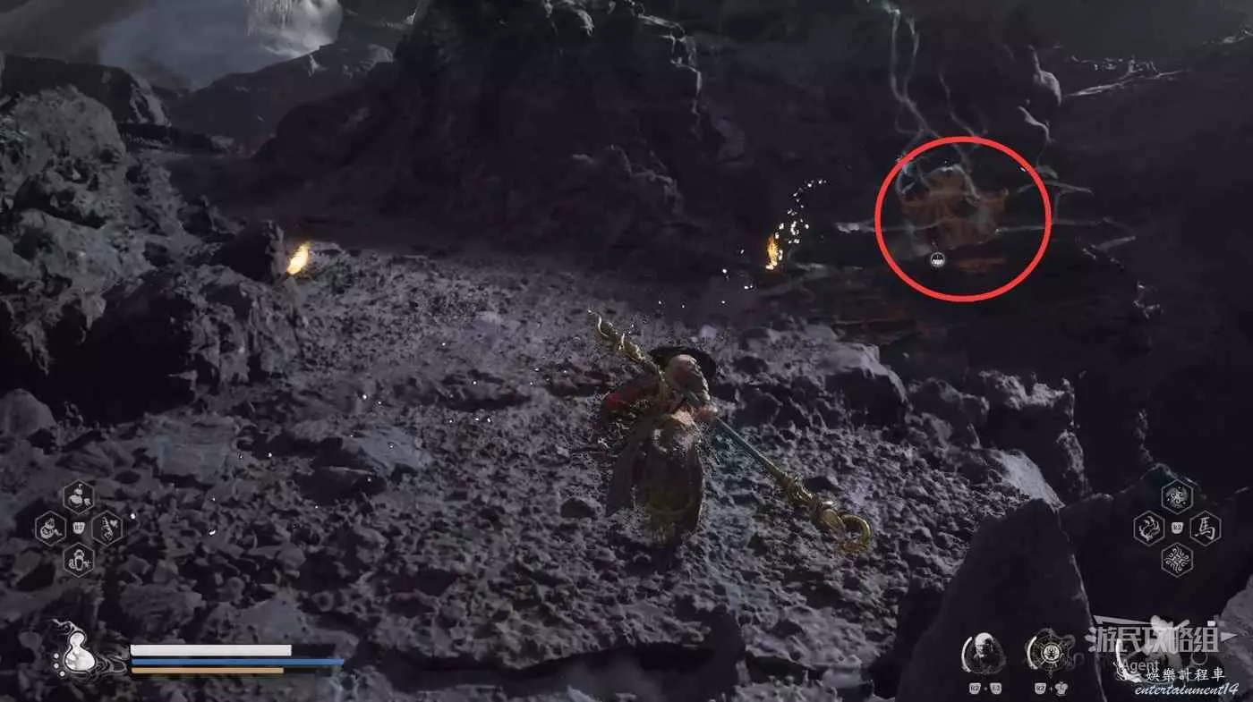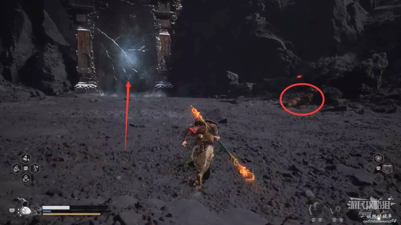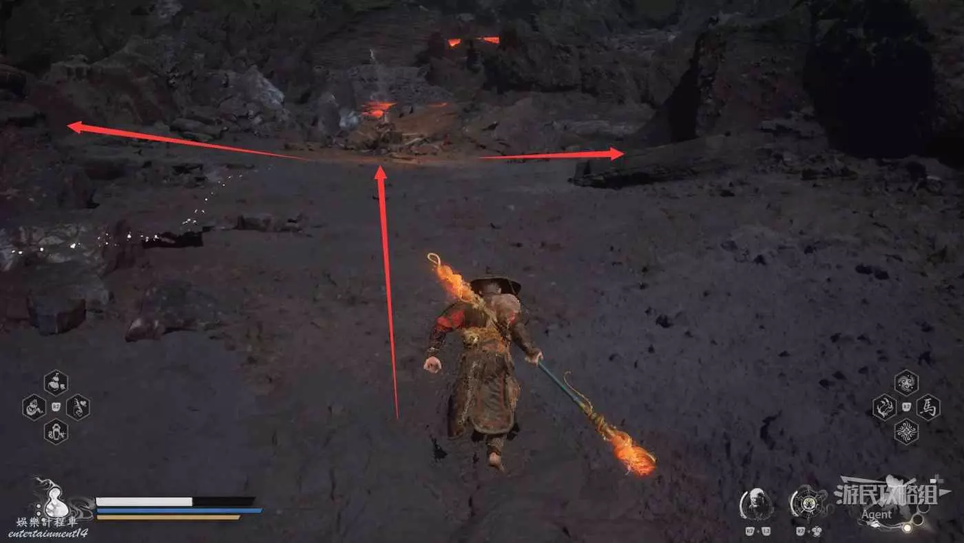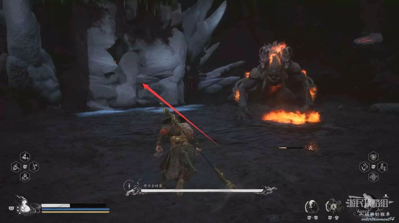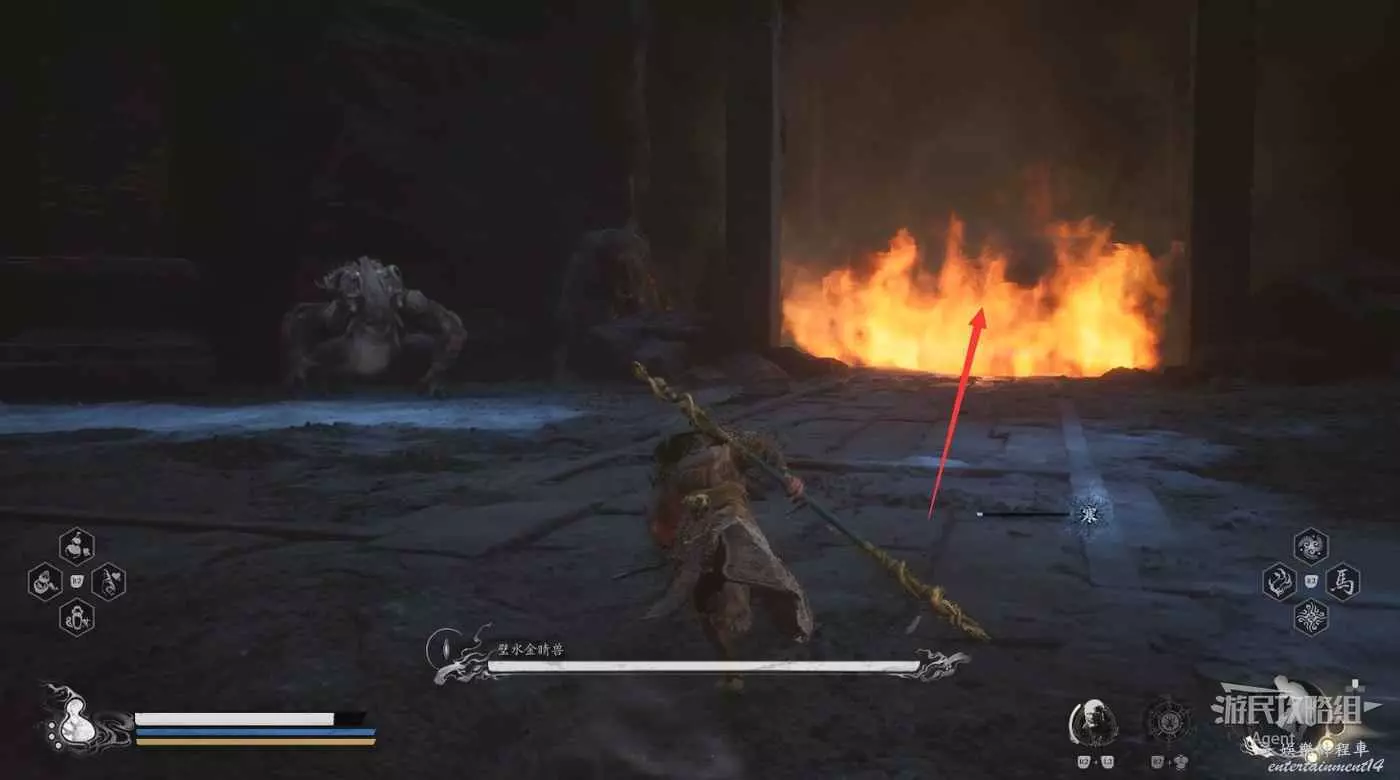 從“隕磚坑”土地廟往回走,找到剛才被火擋住的路,剛才芭蕉扇已經滅了火,走這條隱藏的路前往隱藏關卡。