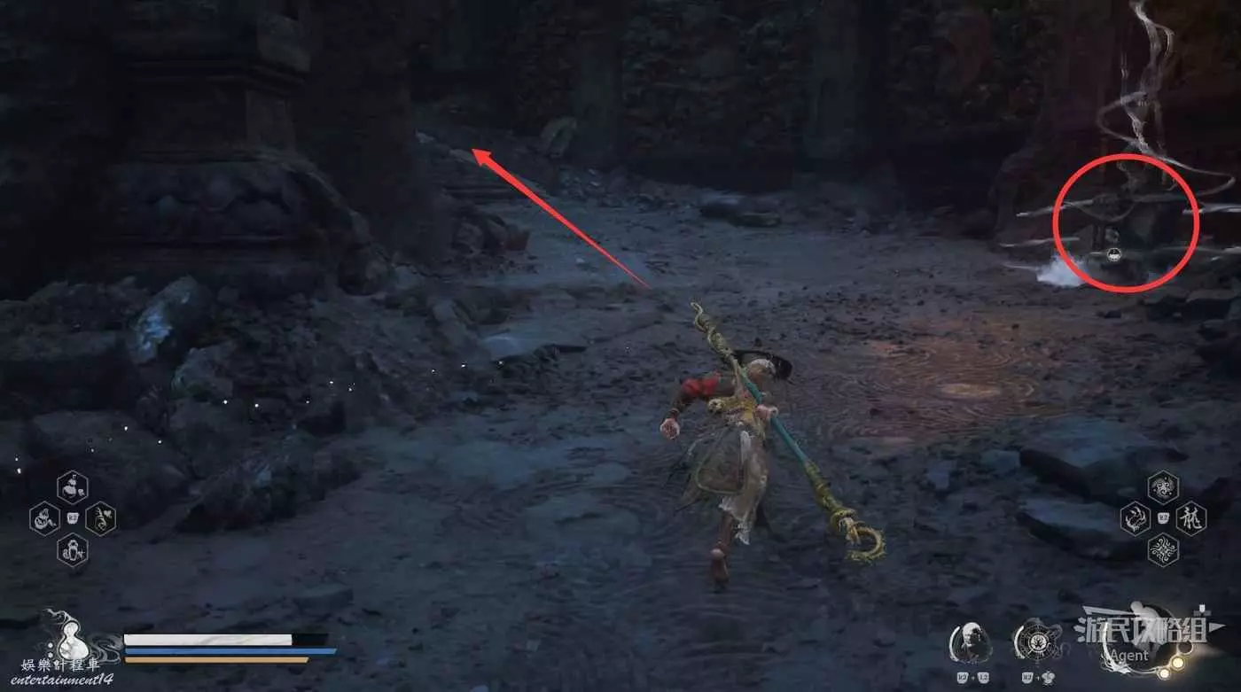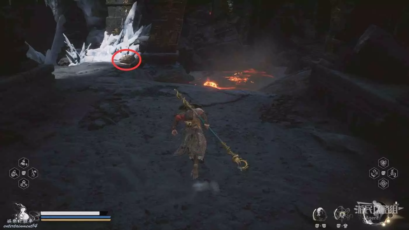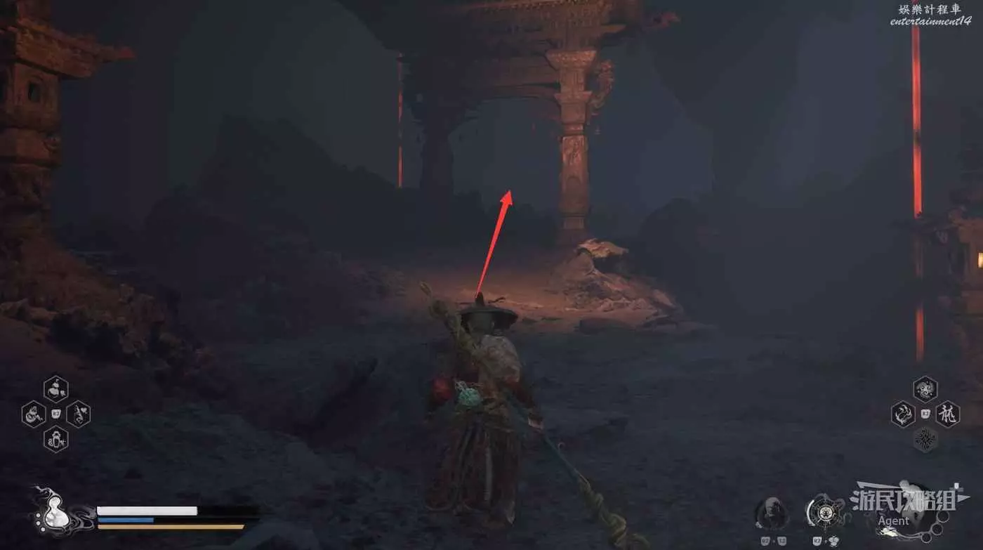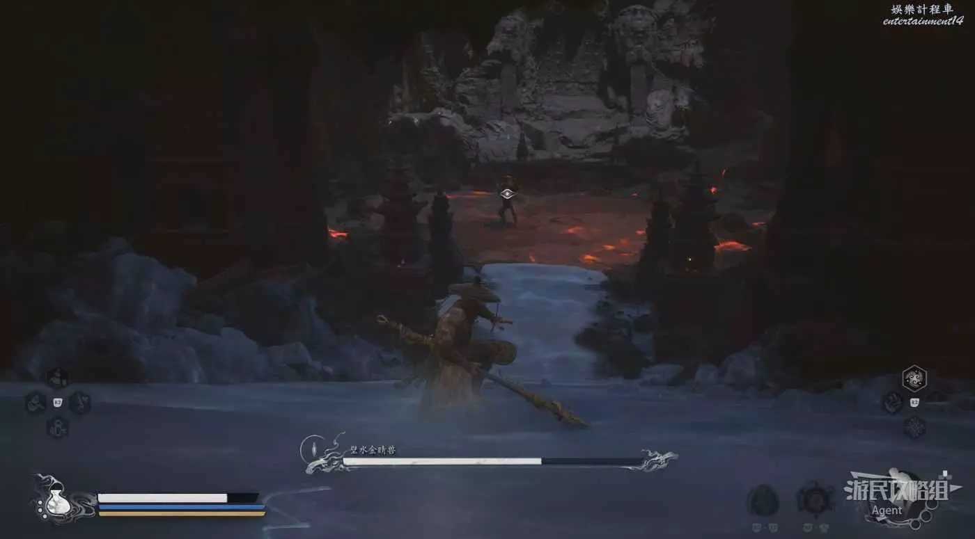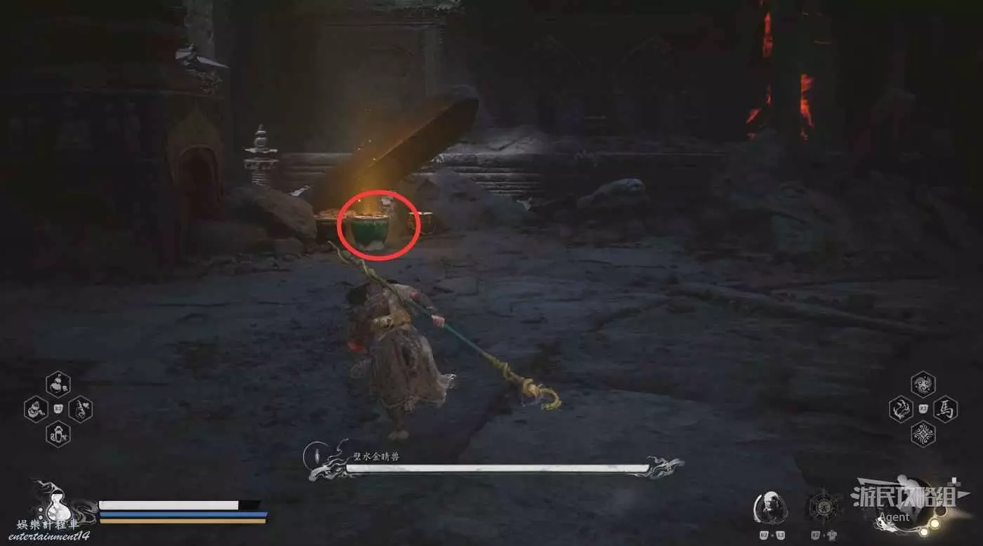 從“隕磚坑”土地廟往回走,找到剛才被火擋住的路,剛才芭蕉扇已經滅了火,走這條隱藏的路前往隱藏關卡。