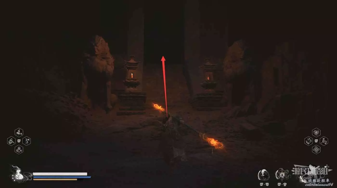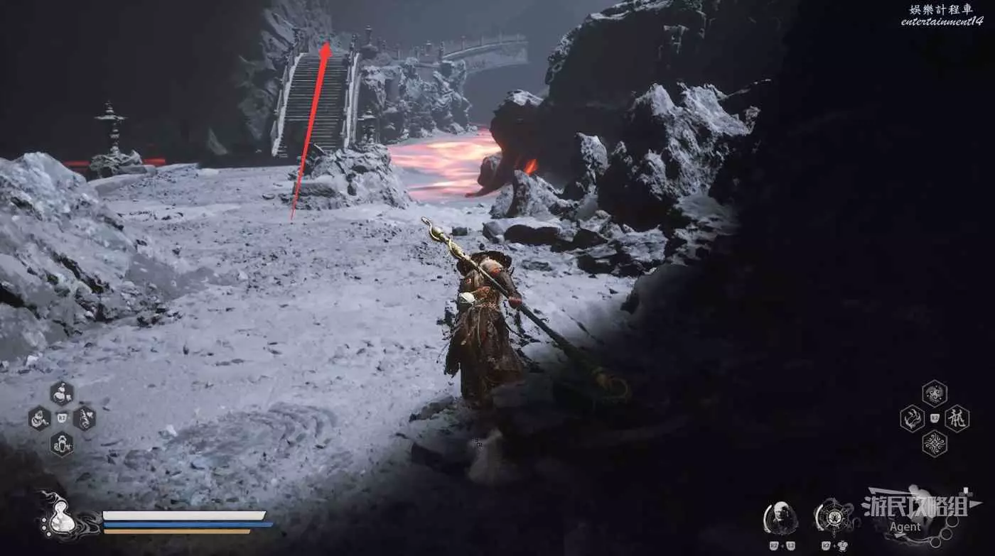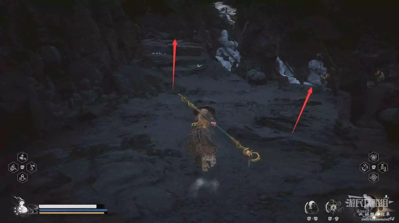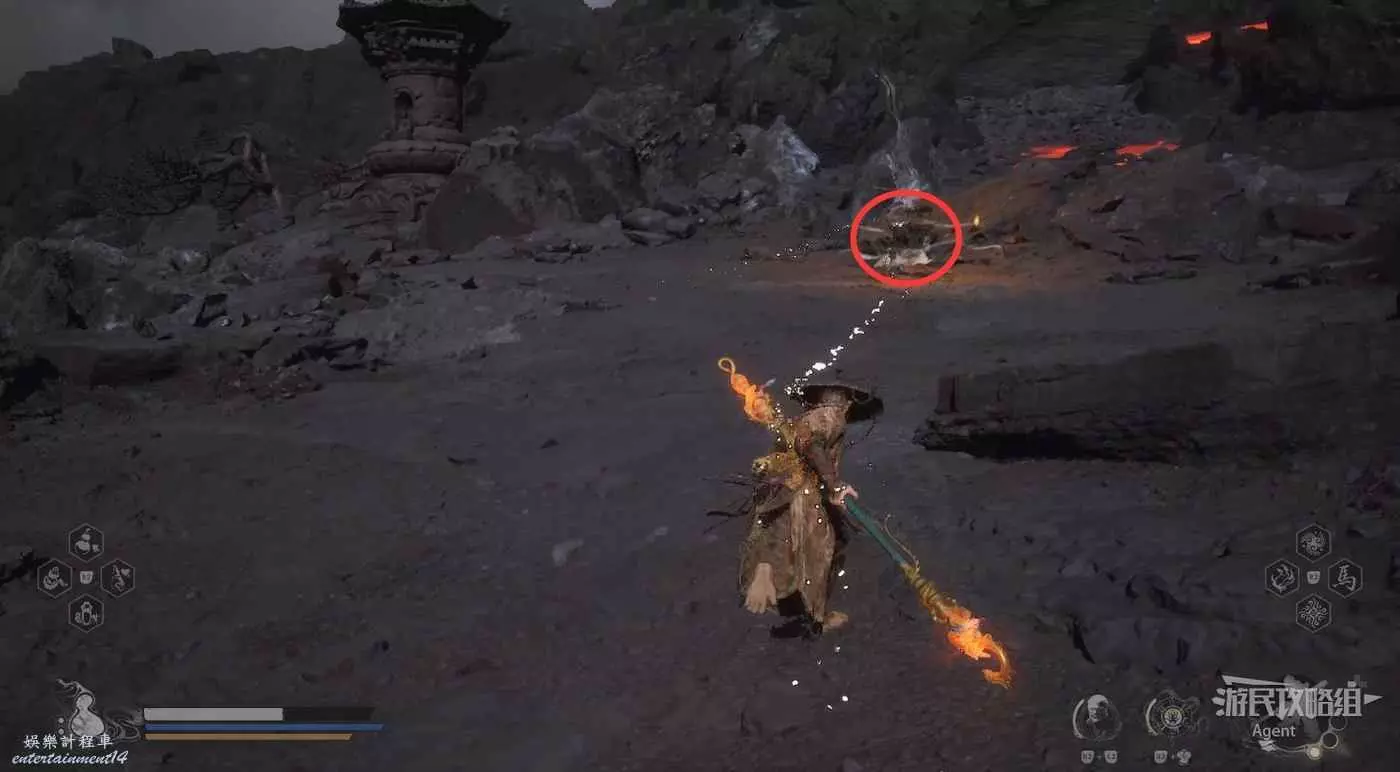 從“隕磚坑”土地廟往回走,找到剛才被火擋住的路,剛才芭蕉扇已經滅了火,走這條隱藏的路前往隱藏關卡。