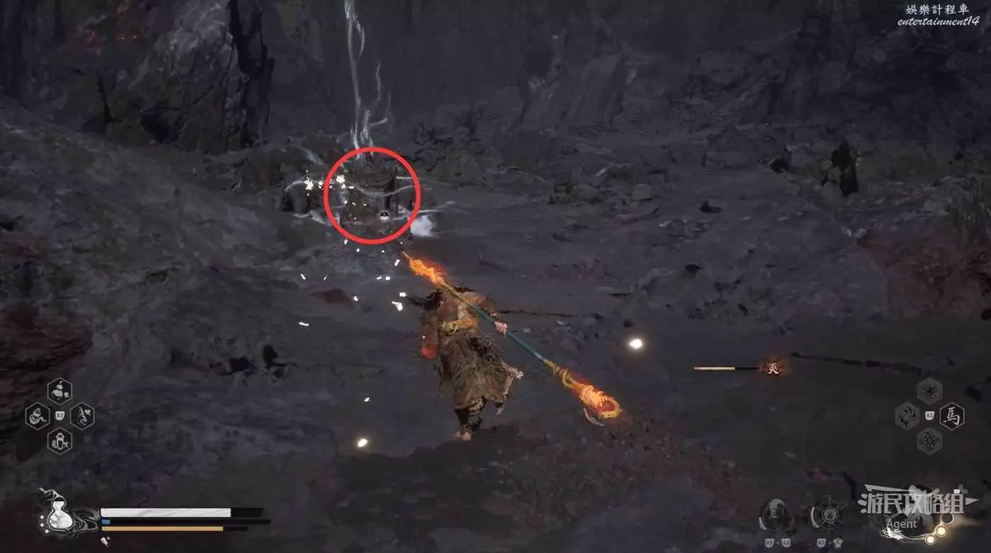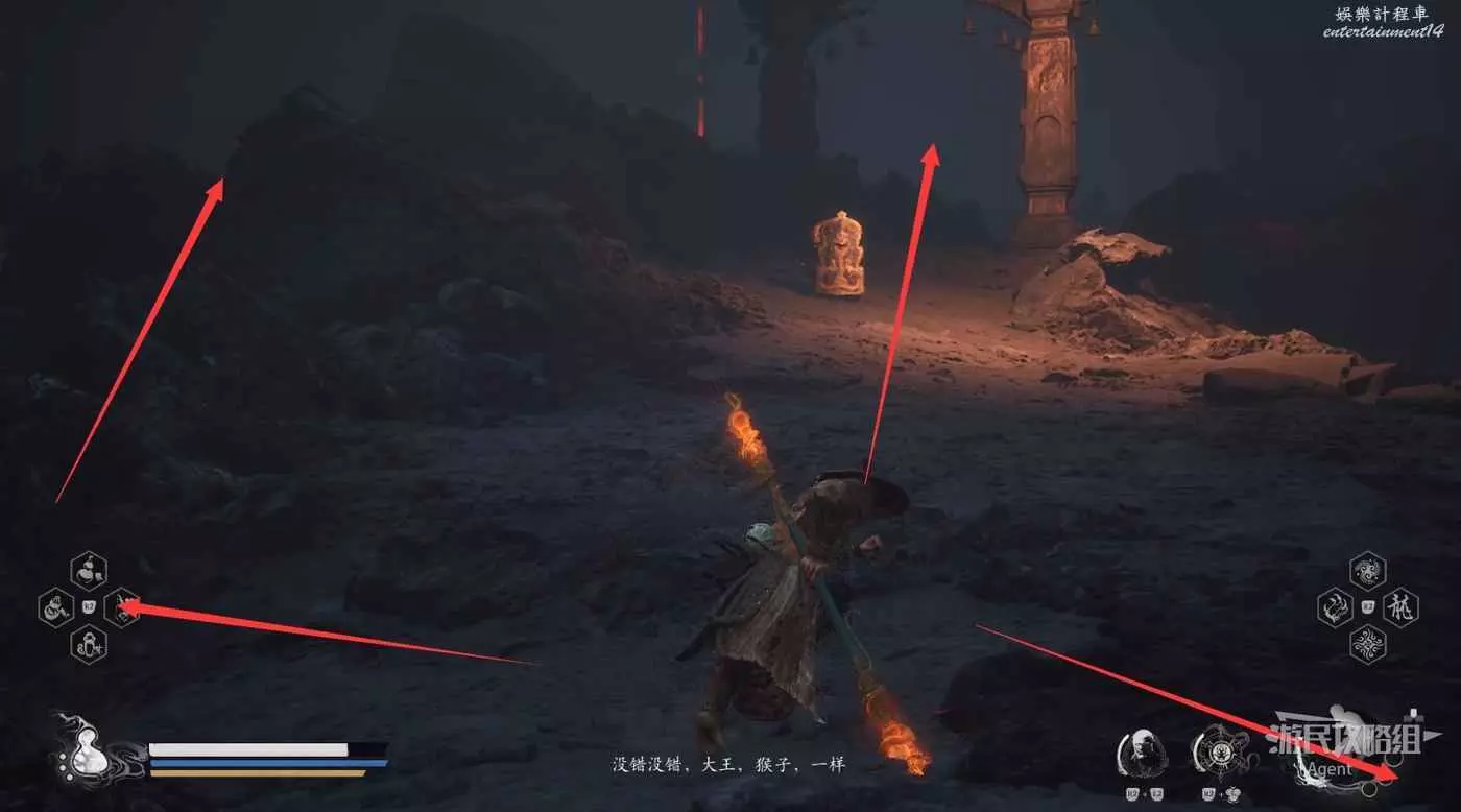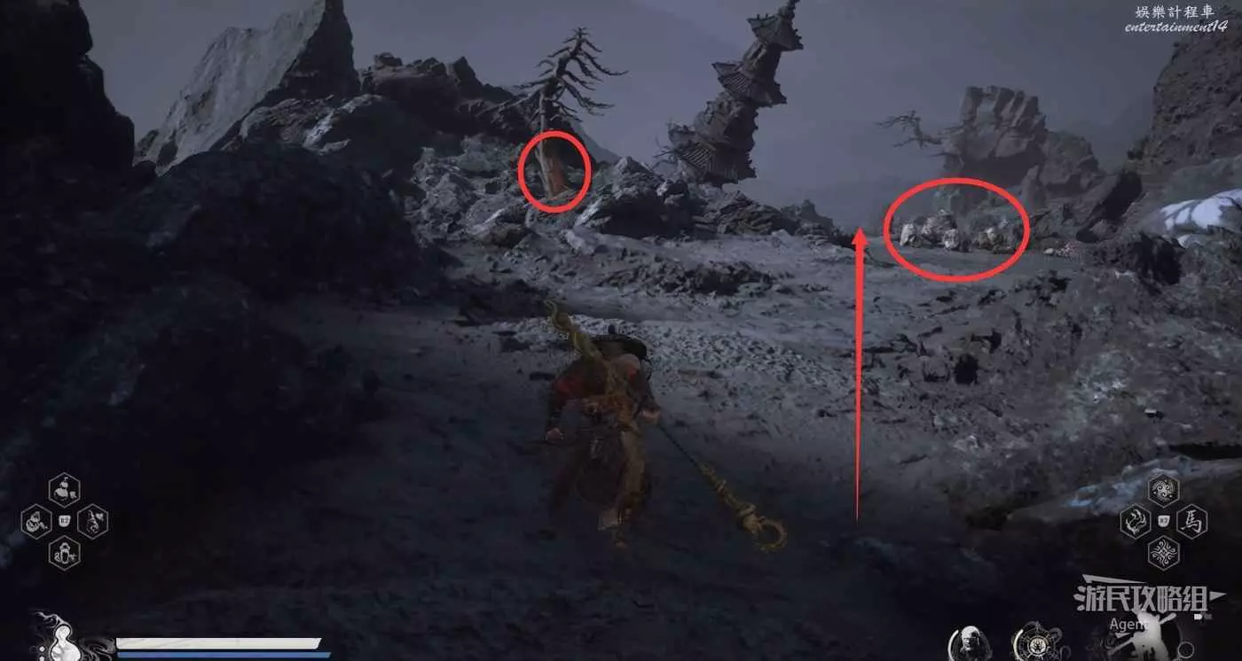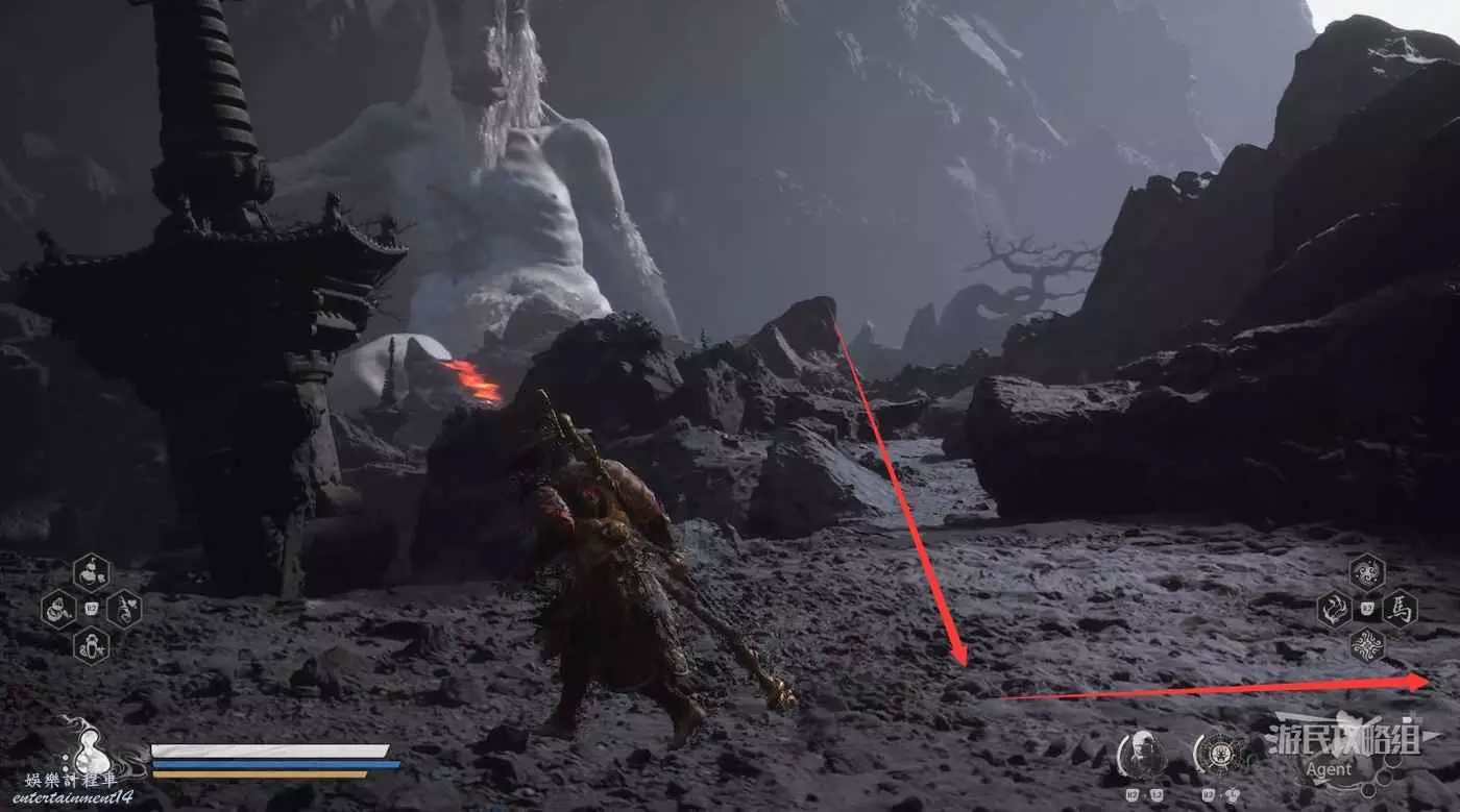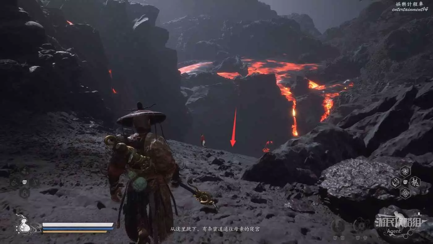從“隕磚坑”土地廟往回走,找到剛才被火擋住的路,剛才芭蕉扇已經滅了火,走這條隱藏的路前往隱藏關卡。