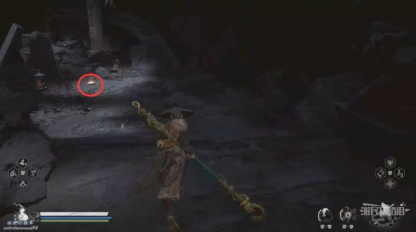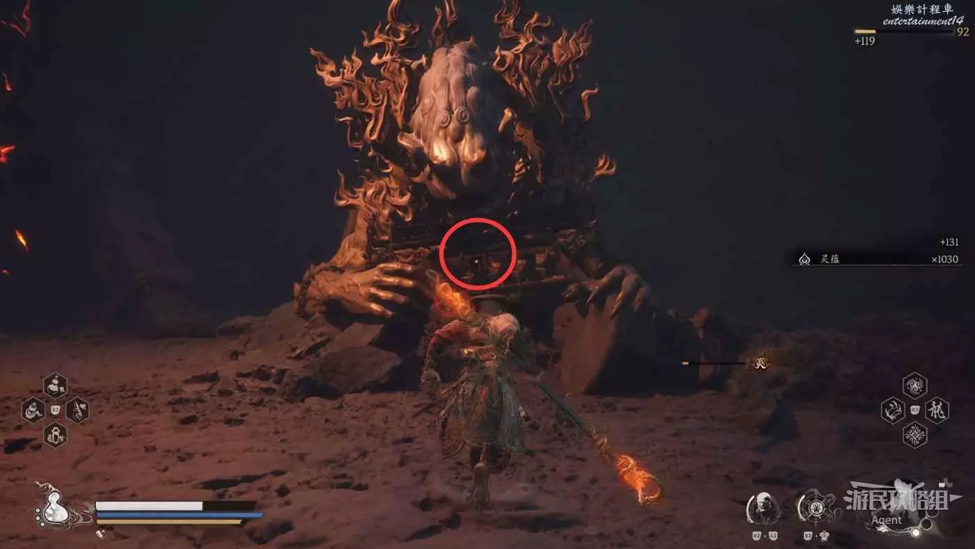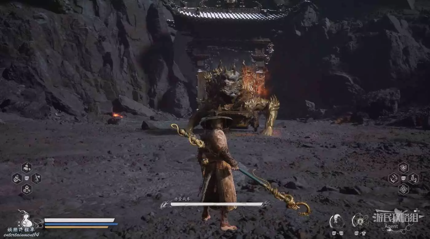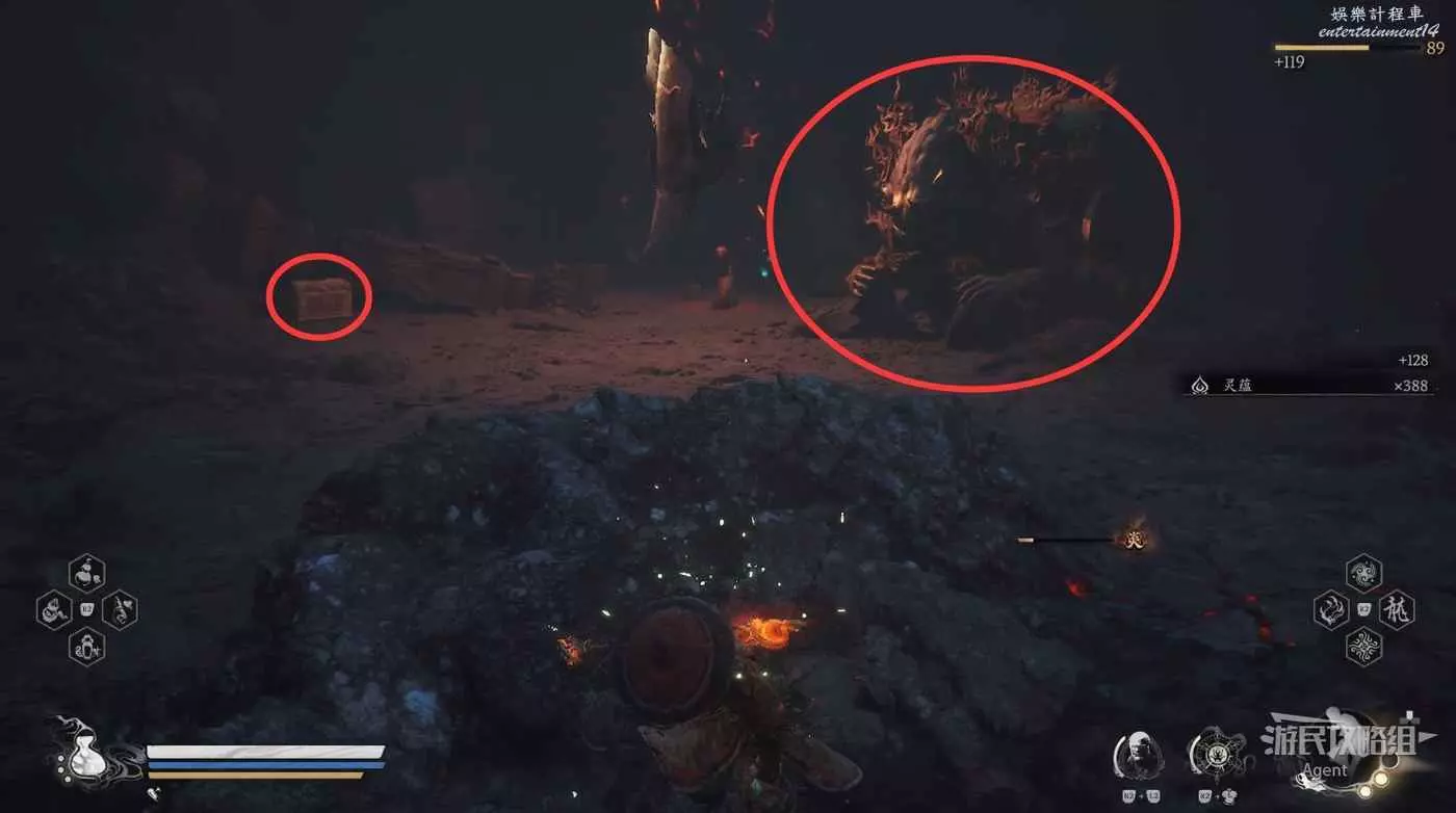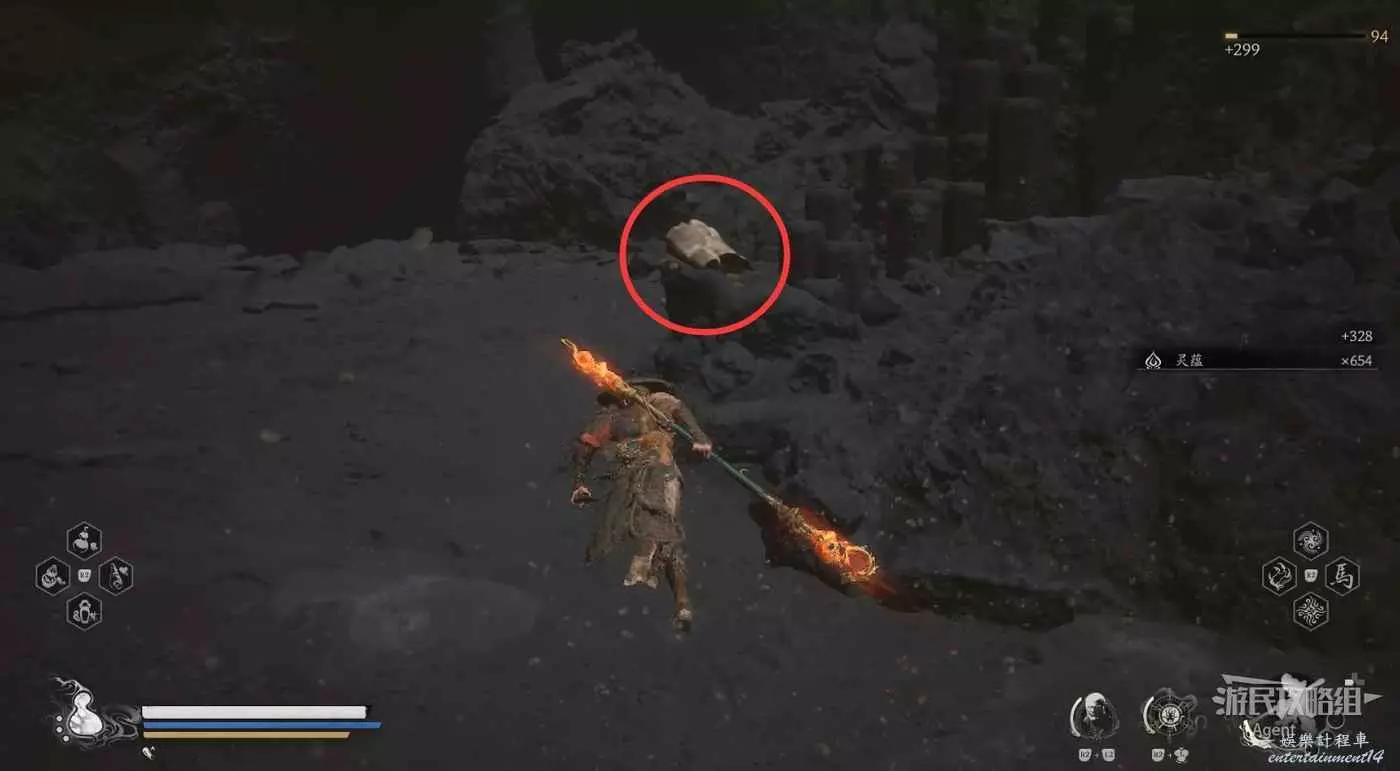 從“隕磚坑”土地廟往回走,找到剛才被火擋住的路,剛才芭蕉扇已經滅了火,走這條隱藏的路前往隱藏關卡。