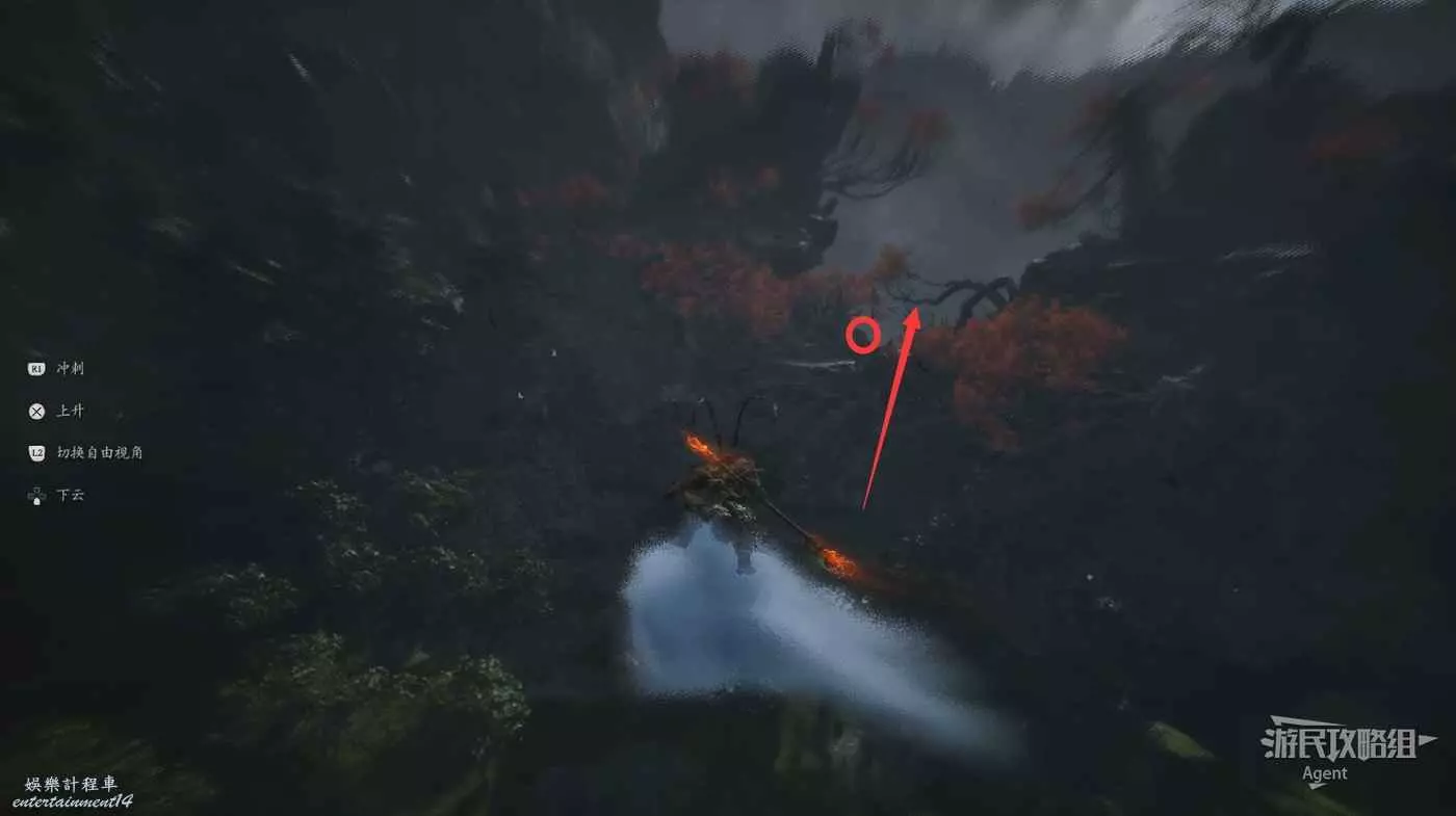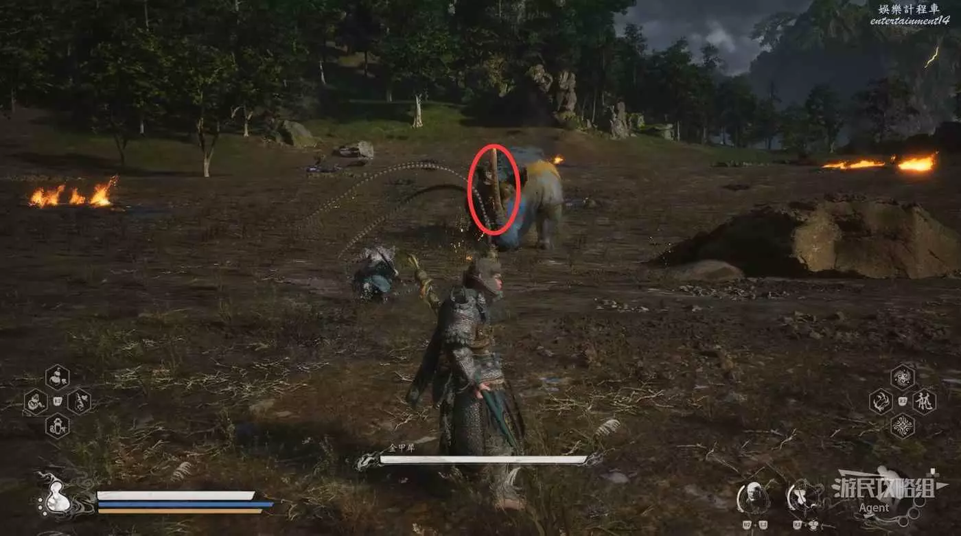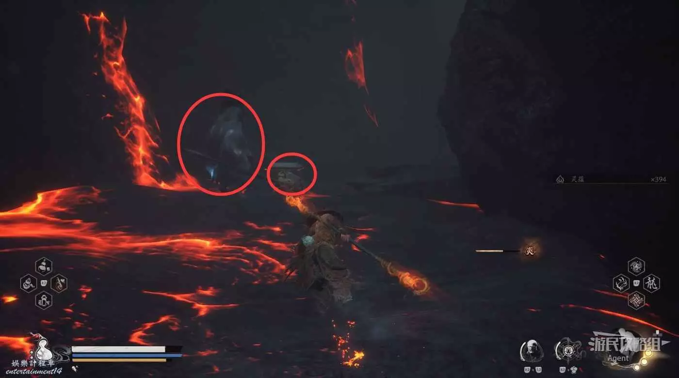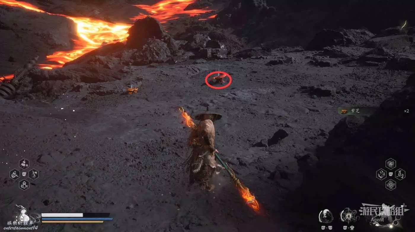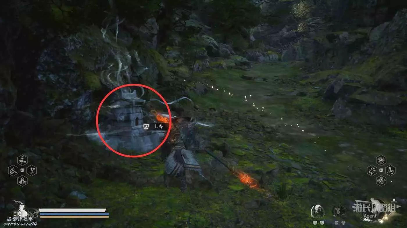 從“隕磚坑”土地廟往回走,找到剛才被火擋住的路,剛才芭蕉扇已經滅了火,走這條隱藏的路前往隱藏關卡。