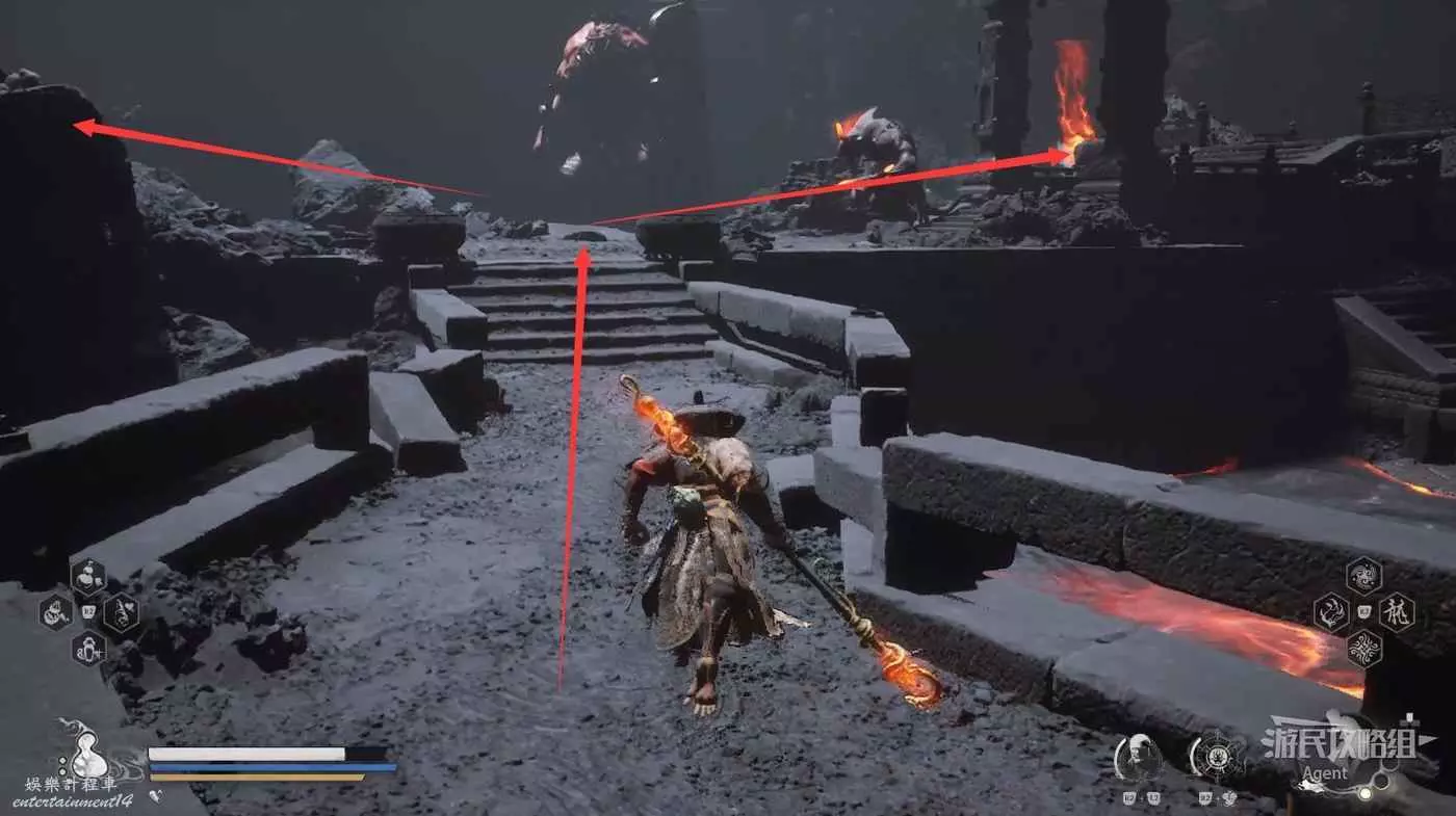 再往前走,看到路邊的火焰,先記住這裡,等下芭蕉扇滅火後,要從這裡前往隱藏關卡。
