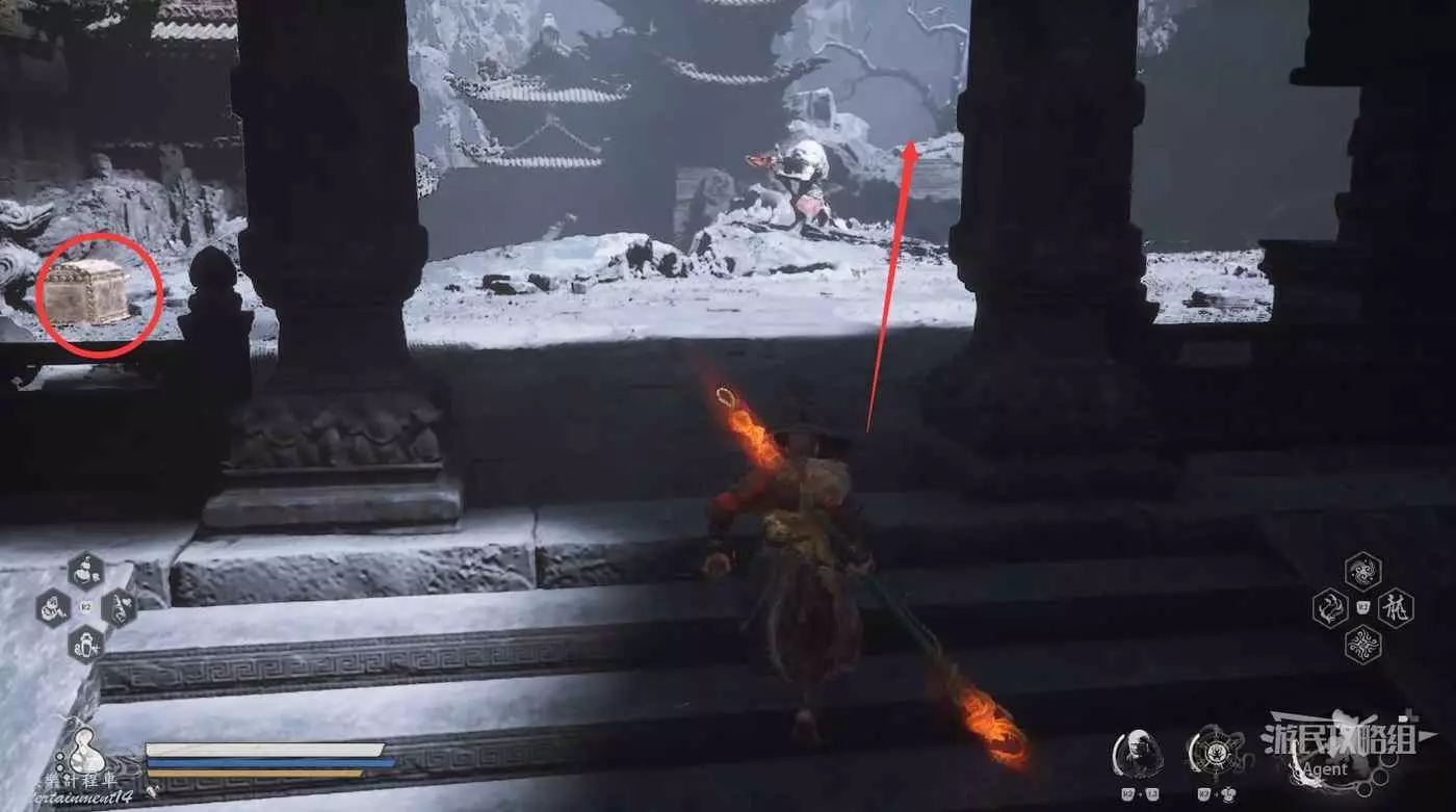 回到翠雲殿,從鐵扇公主座位左邊的路繼續往上走,路邊撿個寶箱,再往上走打紅銀戰車。
