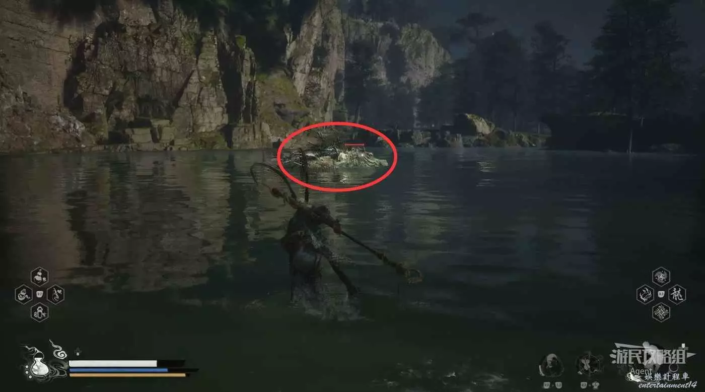 坐在河對岸懸崖邊,發藍光的就是“石子”,它是之前打的石母和石父的孩子。由於很遠處都能看到光,可作為標誌物。