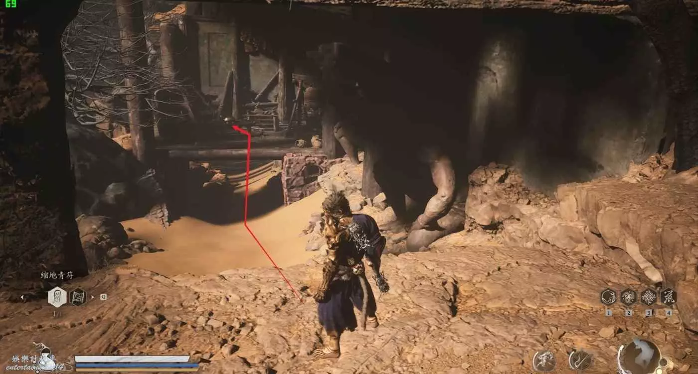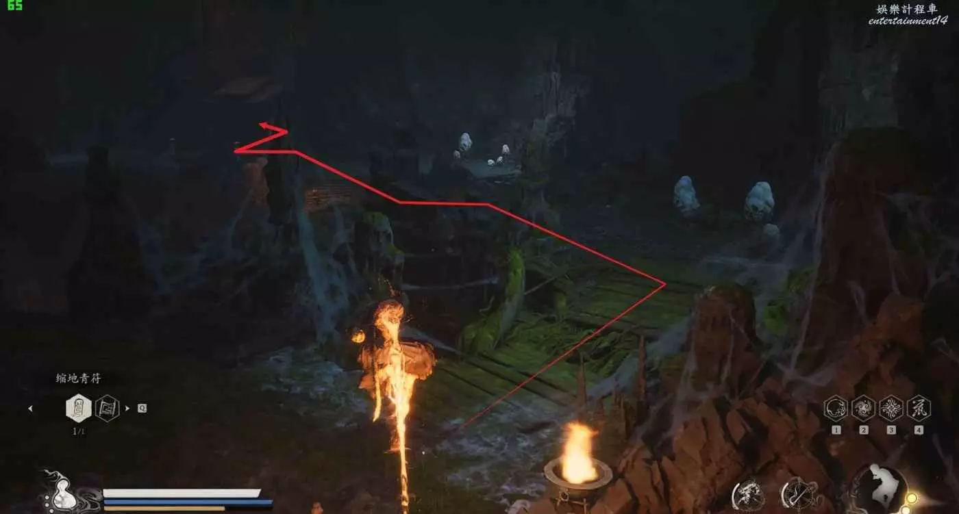 13、虎舍利「黃風嶺—臥虎寺—寺門」往上進入地窖,到滑梯這裡二段跳上去即可獲得「跳躍時機」