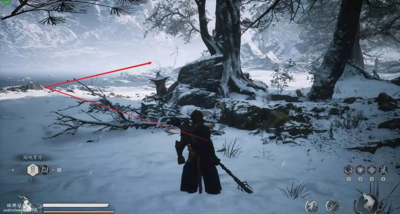 15、困龍鬚「小西天—雪山徑—照鑒湖」,然後到湖上一直往右側跑,在前方的樹下就能拿到「很遠」