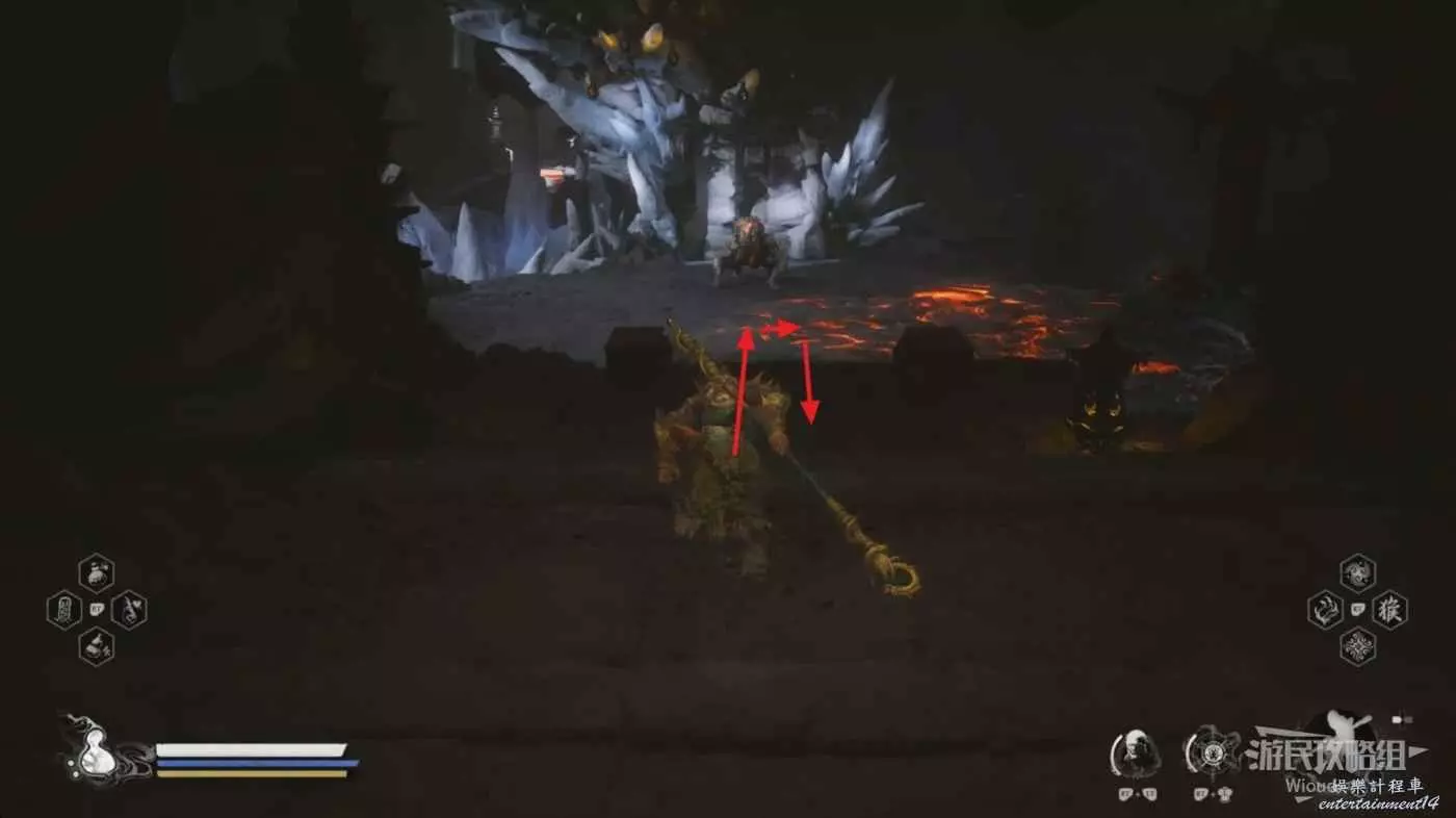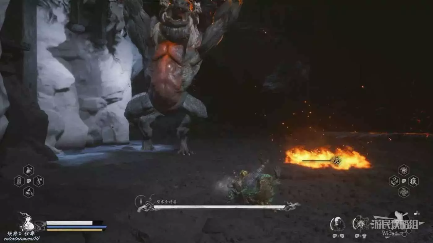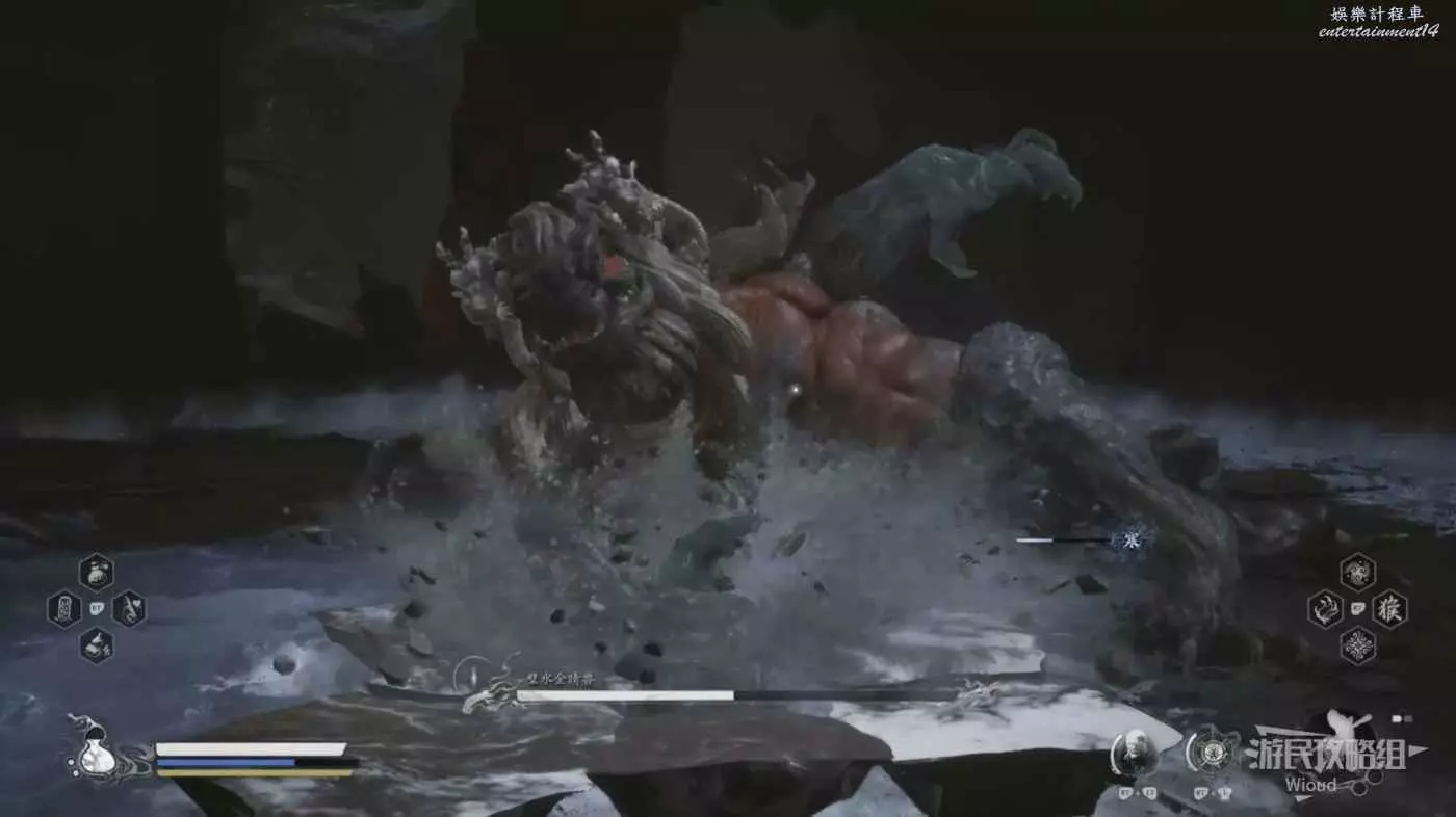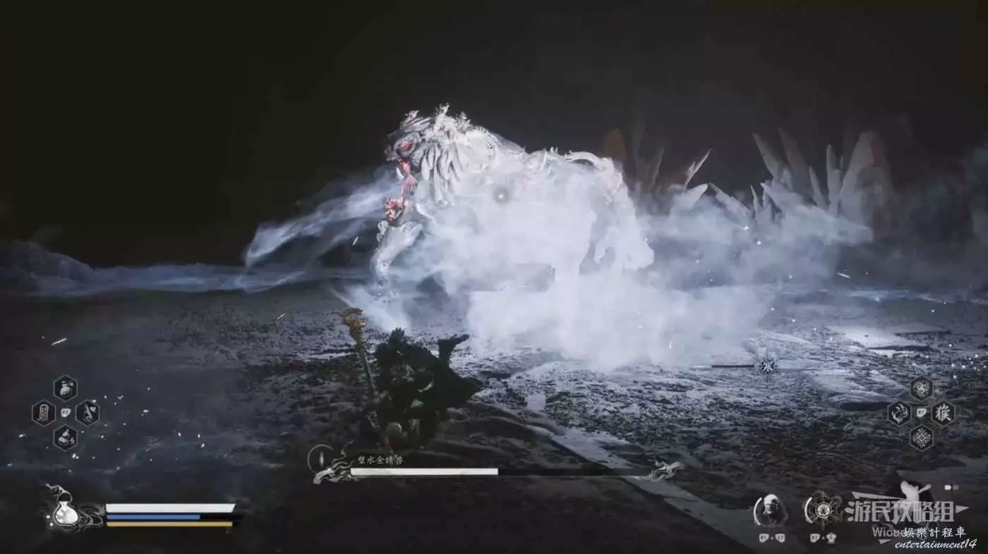 否則會被璧水金睛獸無限壓制而降低容錯率,而且璧水金睛獸的血條很厚,通常開局定身術+身外身法組合無法對璧水金睛獸造成有效傷害,因此還是以躲避+普攻攢重擊的流程為主,底下還會介紹一種蹺課方法。