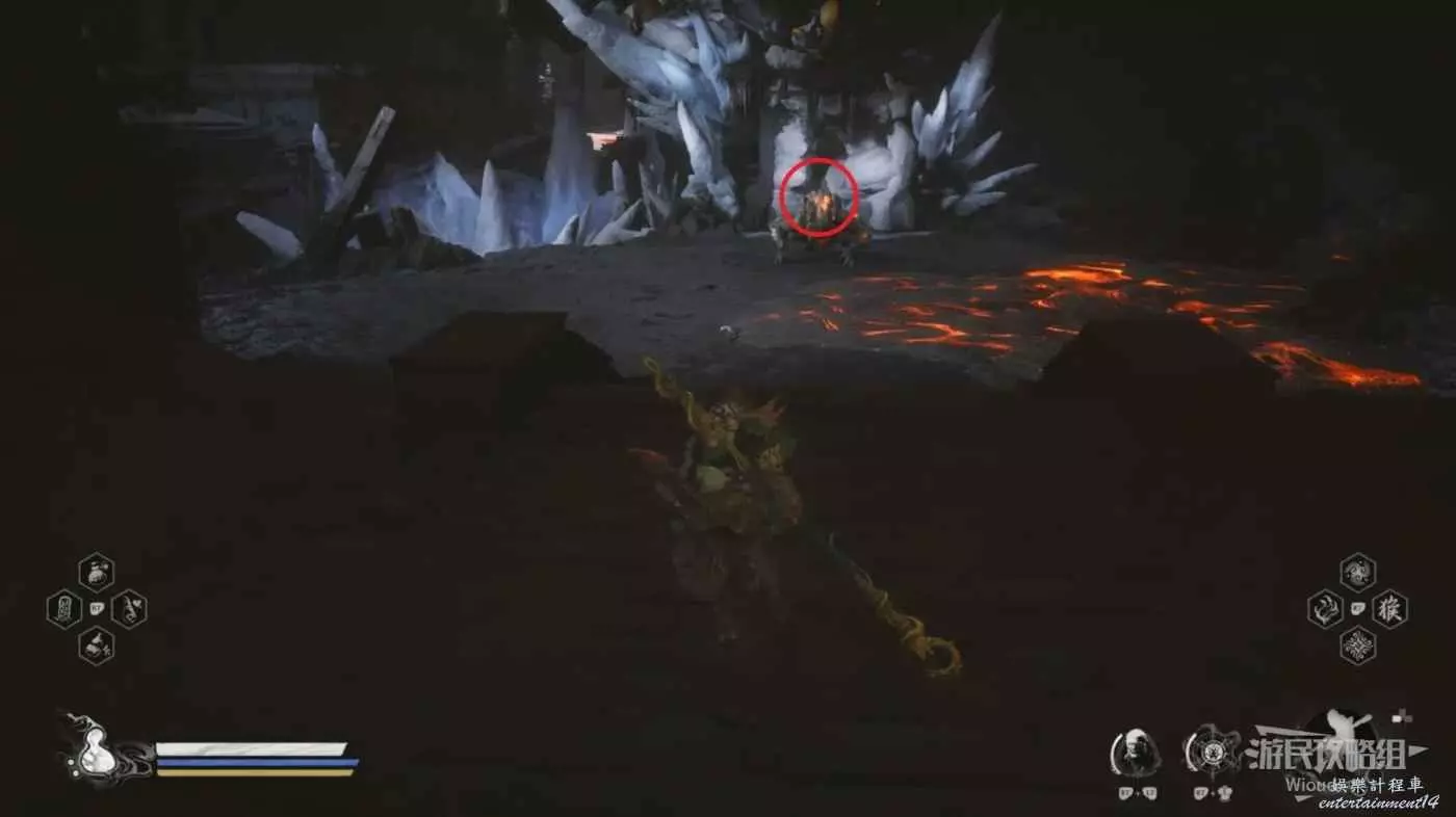 來到第二個戰鬥場地可以看到第二次與璧水金睛獸戰鬥場地的前方被一團火擋住,而璧水金睛獸的第二心態是冰形態的,我們要模仿第一形態那樣站在下圖畫圈的位置,一直躲避璧水金睛獸的技能,等待一個冰形態的吐息澆滅火焰繼續沿路走到達下一個場景觸發第三形態。