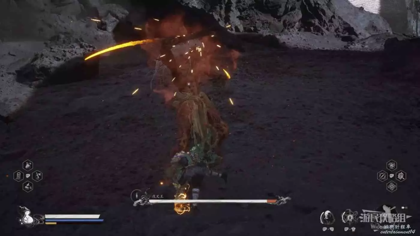 蓄滿跑到夜叉王的位置繼續重擊,夜叉王看到我們過來也會使用一個小連段,儘量不要讓他使出來,基本夜叉王剛滑鏟那一下我們就能劈下去,然後再次直線遠離夜叉王。