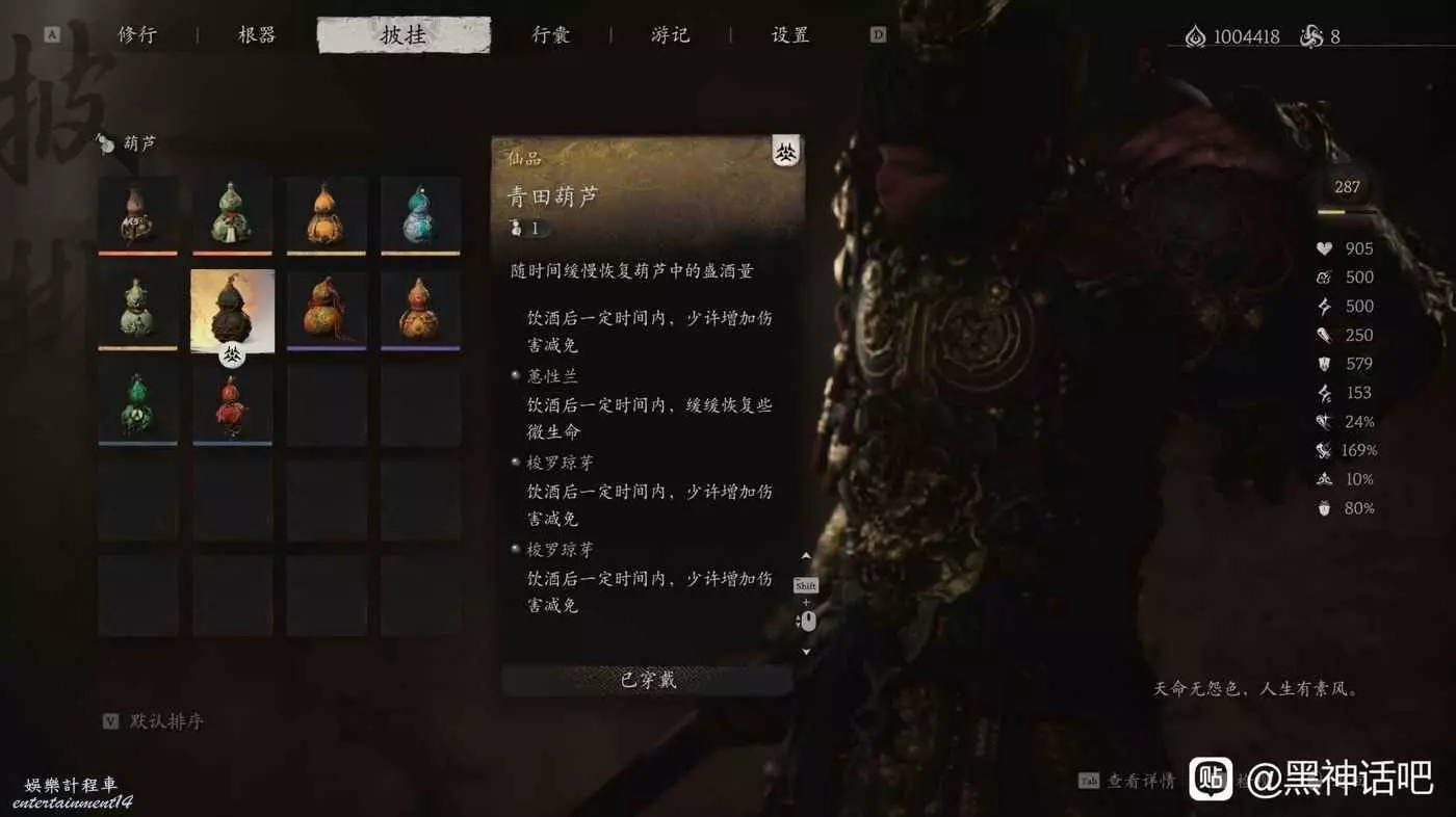 帶上青田葫蘆(二周目申猴購處購買),泡酒物選擇3個梭羅瓊芽(在沙門村村裡的箱子打開獲得),珍玩選擇博山爐(首次擊殺赤髯龍獲得),喝一口酒就能獲得45%減傷。珍玩帶一個琥珀念珠加快攢棍勢速度,更高頻進入大聖模式