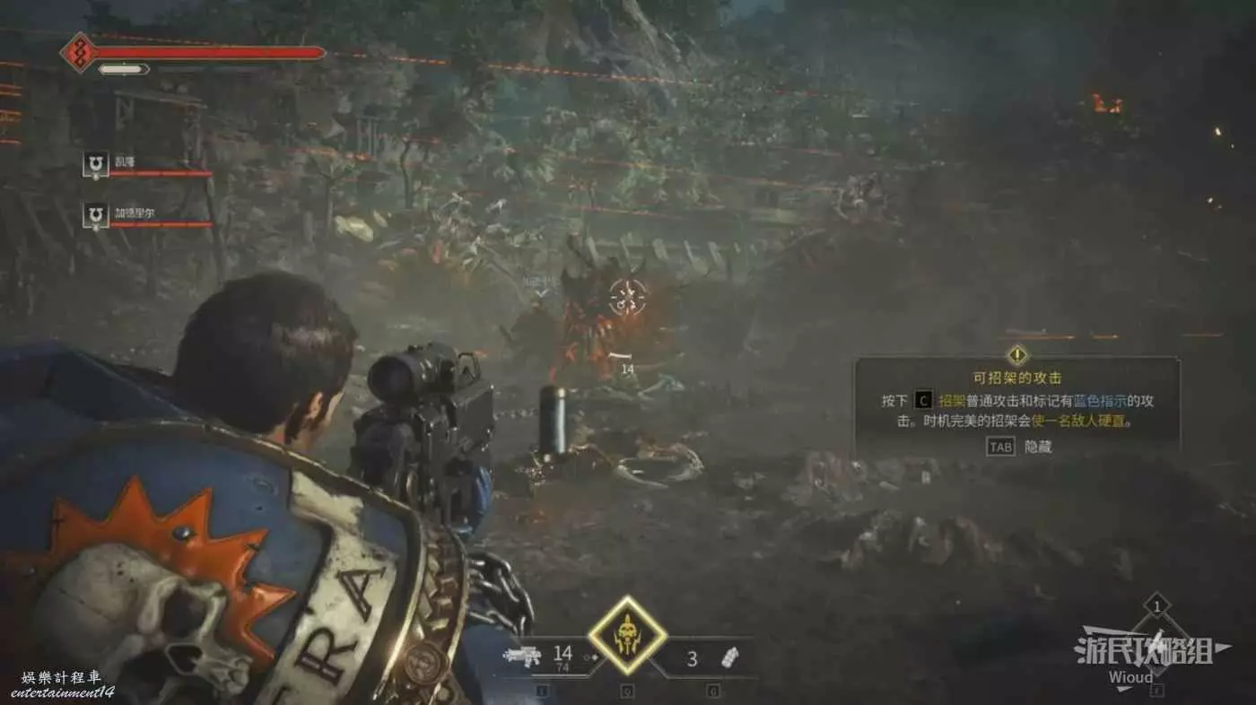遇到第二波敵人時會出現一個精英怪敵人,因為是教學的原因攻擊慾望不強,用鏈鋸劍打兩套就能將其擊敗。
