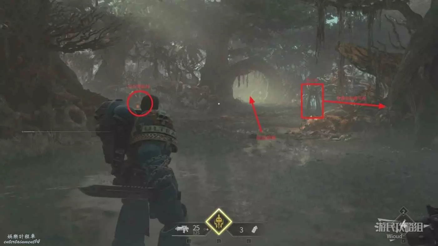 沼澤區起始點左前方,被一堆花朵擋住的口子裡有一個醫療激勵劑,右側軍火庫繼續往右走可以拿一個帶榴彈的爆矢槍,完事往前進的路走,不遠處可以看到左前方有一大片花。