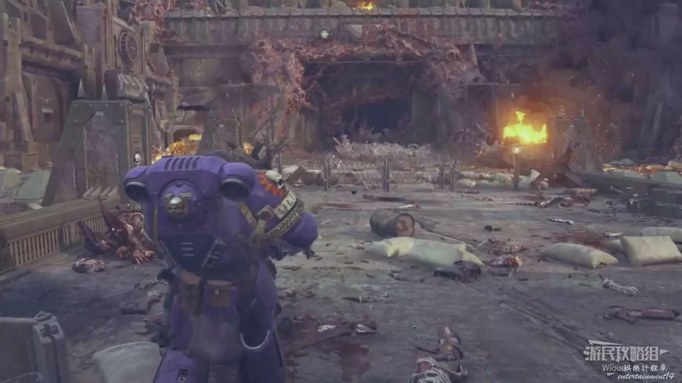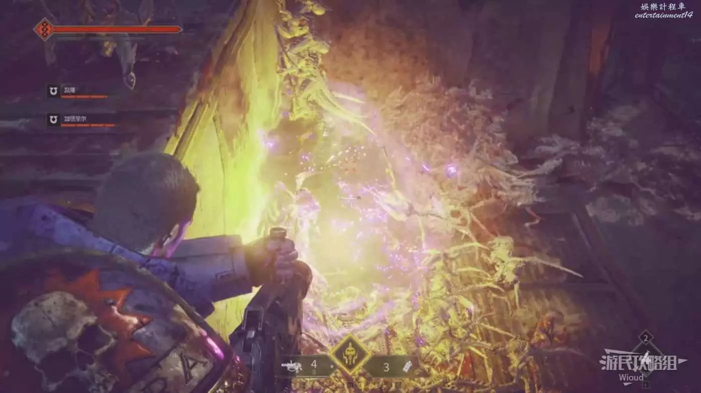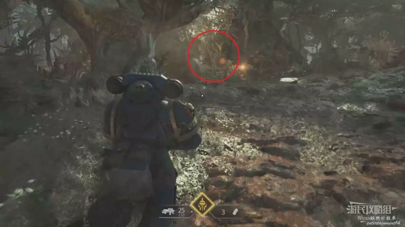 劇情結束沿路走,觸發一波防守戰,依然是一波蟲潮往左中右三個方嚮往上爬,現在甚至都不用手榴彈,離近點一發熱熔槍就能破壞下方一堆蟲子的陣型。我們星際戰士的熱熔武器是這樣的。