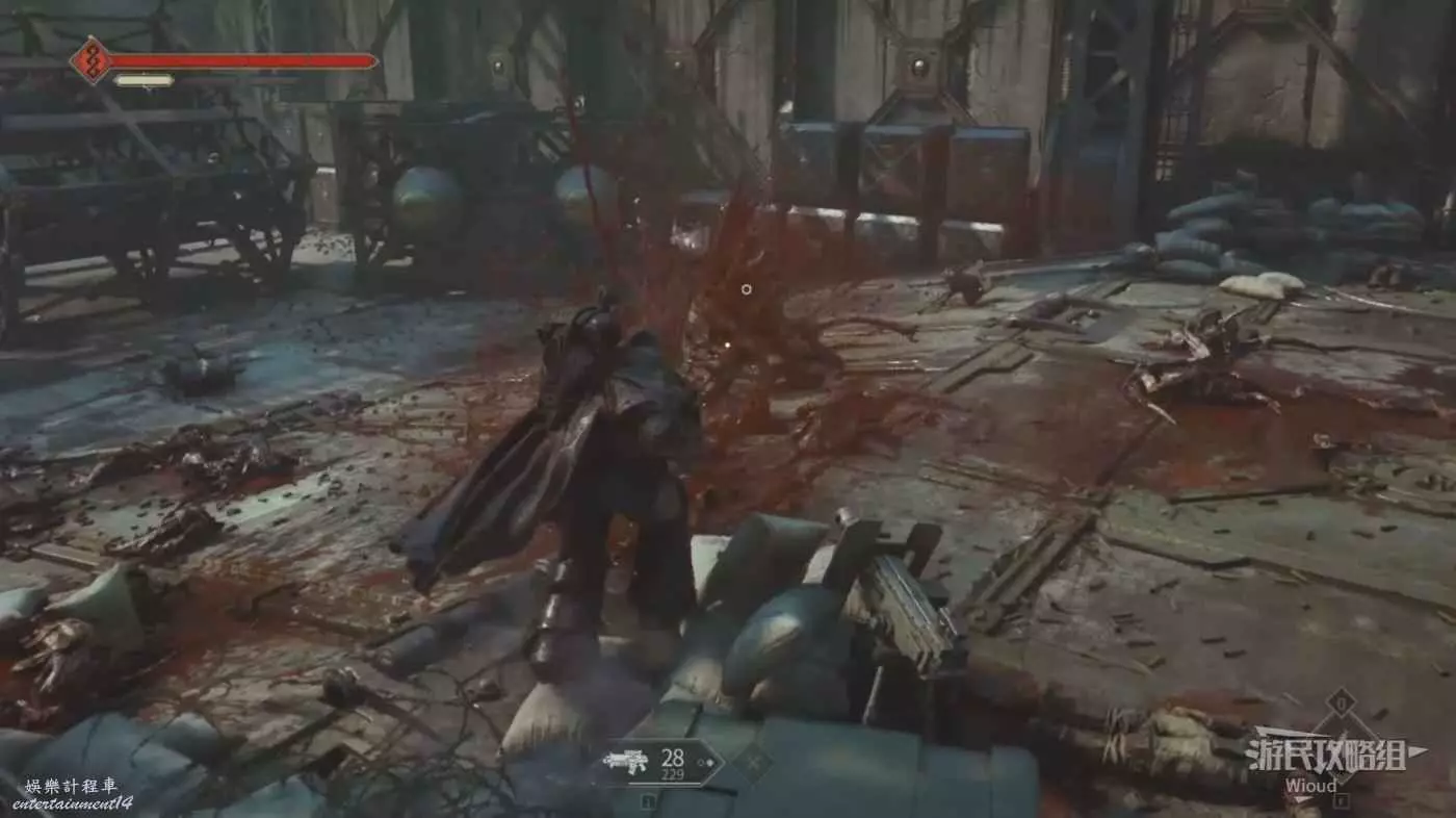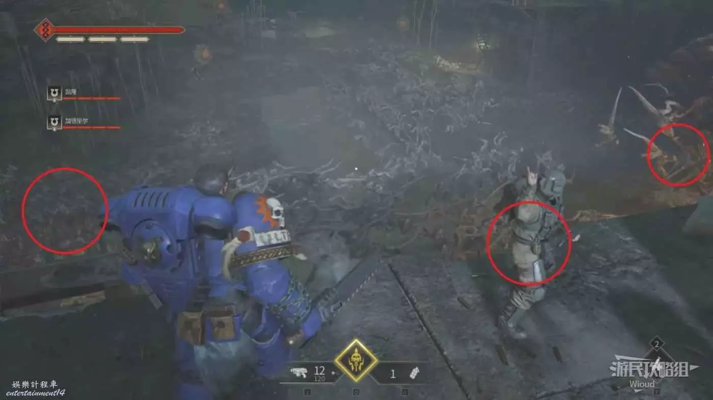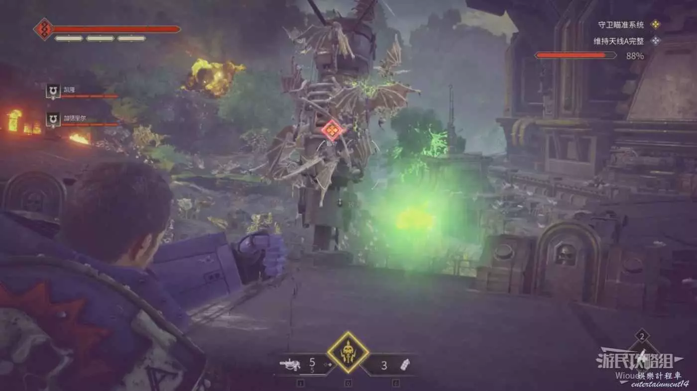 劇情結束沿路走,觸發一波防守戰,依然是一波蟲潮往左中右三個方嚮往上爬,現在甚至都不用手榴彈,離近點一發熱熔槍就能破壞下方一堆蟲子的陣型。我們星際戰士的熱熔武器是這樣的。