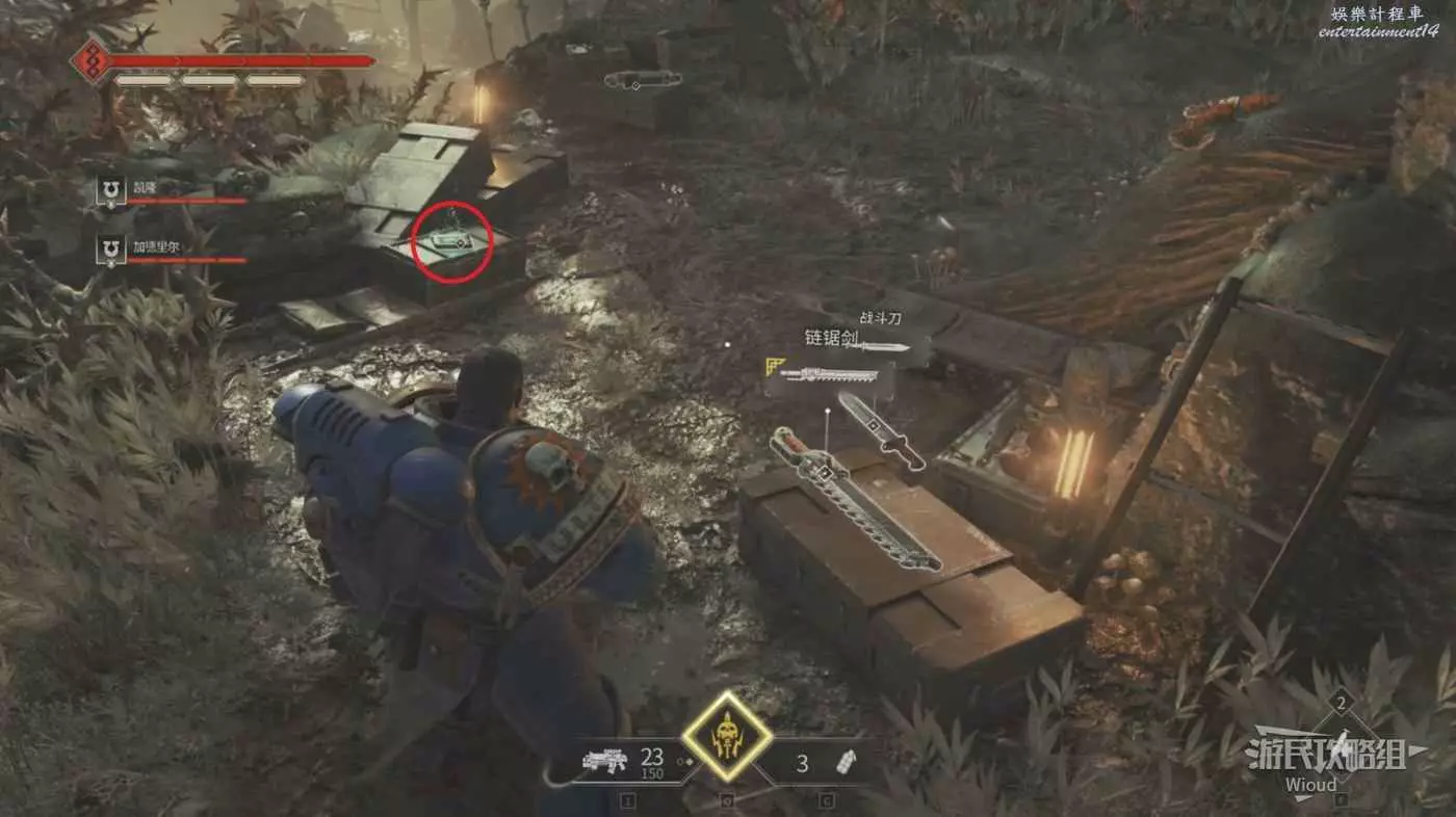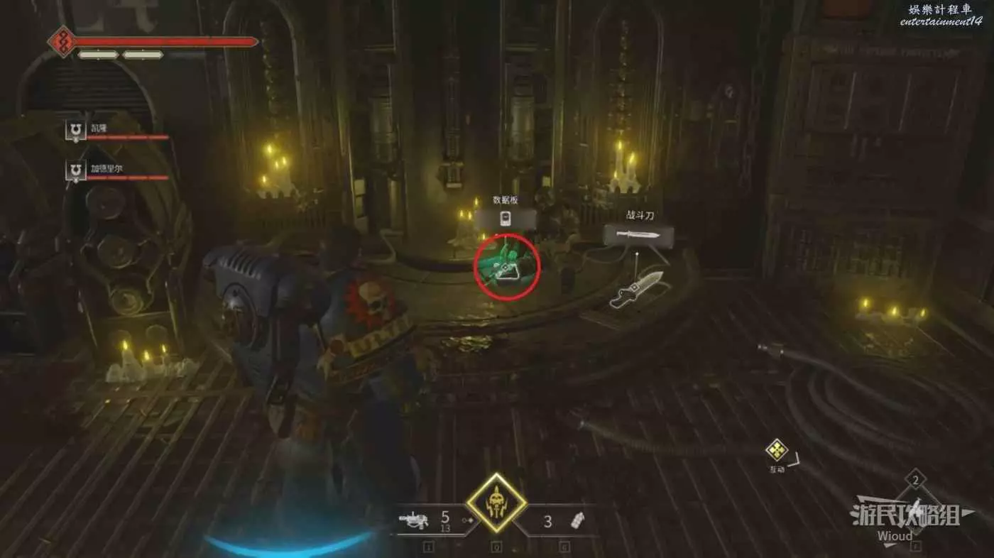 先拾取下方第二個資料版,然後繞一圈回到剛才上來的位置,這回往左邊的路走,看到一堆士兵,觸發防守戰鬥。