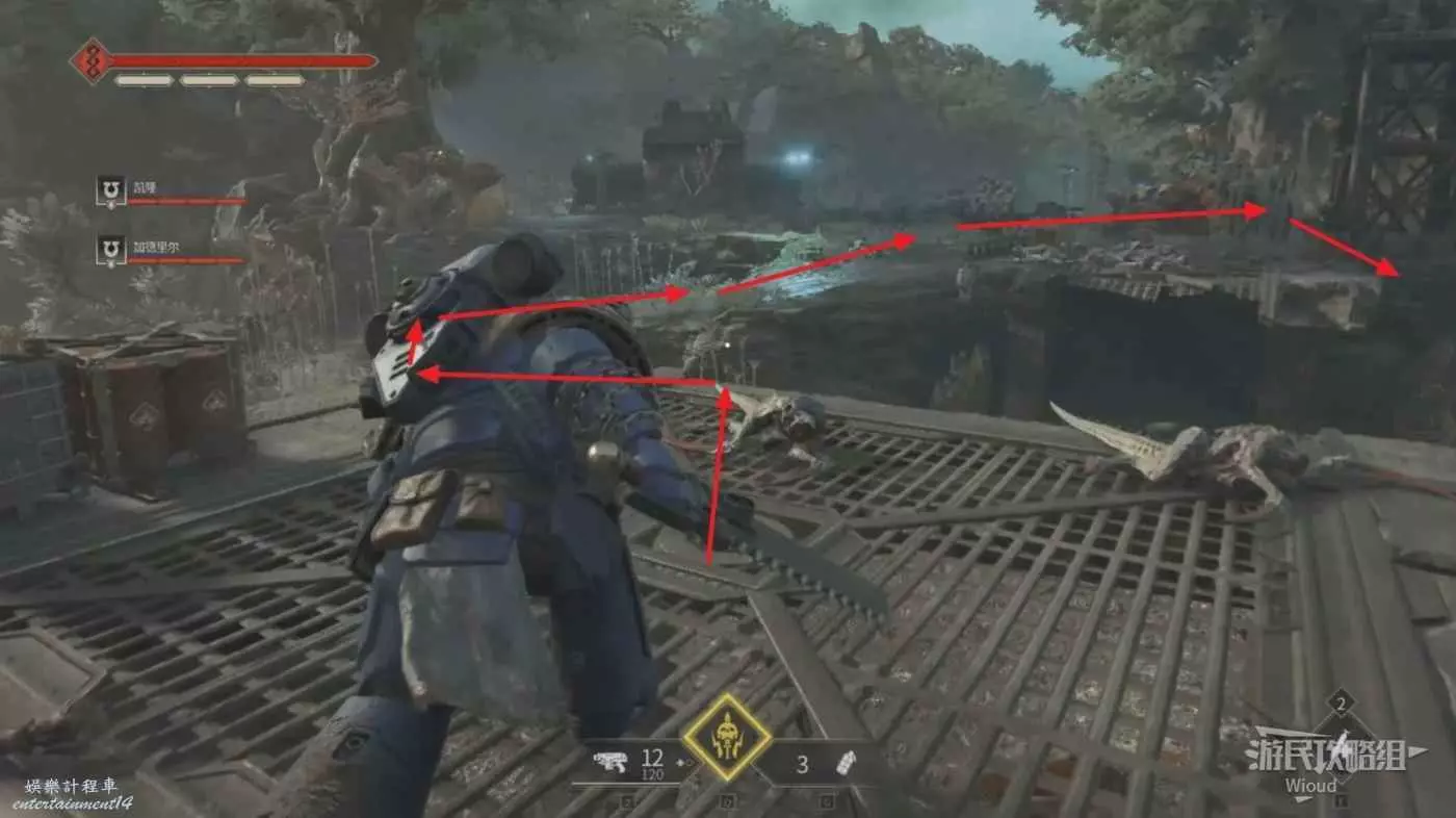 然後一直往前走,到達一個被炸段的橋位置,先擊敗周圍的蟲子,然後往橋下面跳,沿著下圖所示路線往對面橋的右側跳下去。
