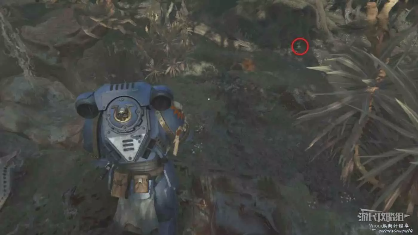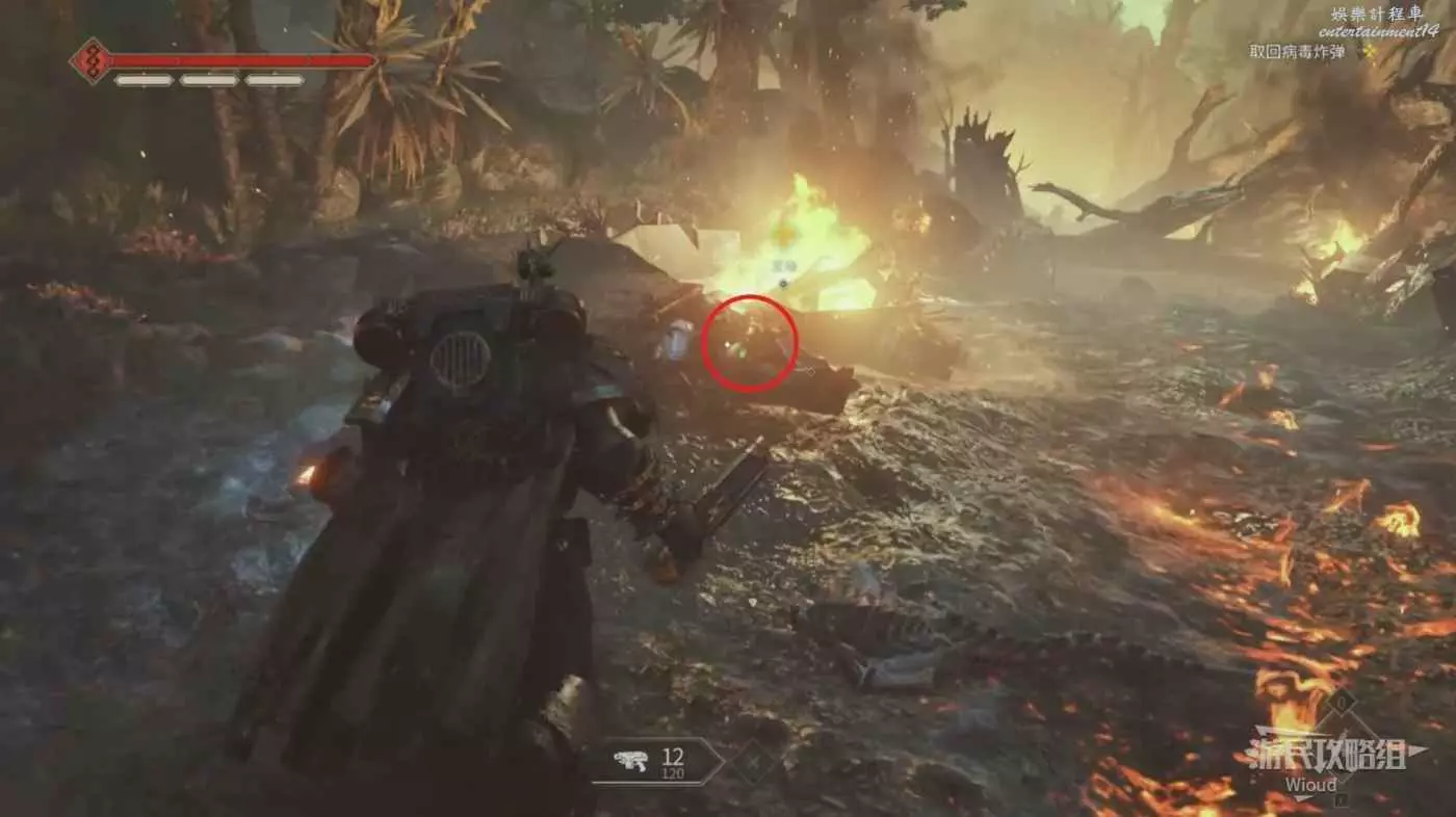擊敗所有敵人後推動旁邊的石塊繼續走,再次擊敗一大群來襲的敵人到達一塊著火的區域,也是死亡守望小隊飛船的墜毀位置。