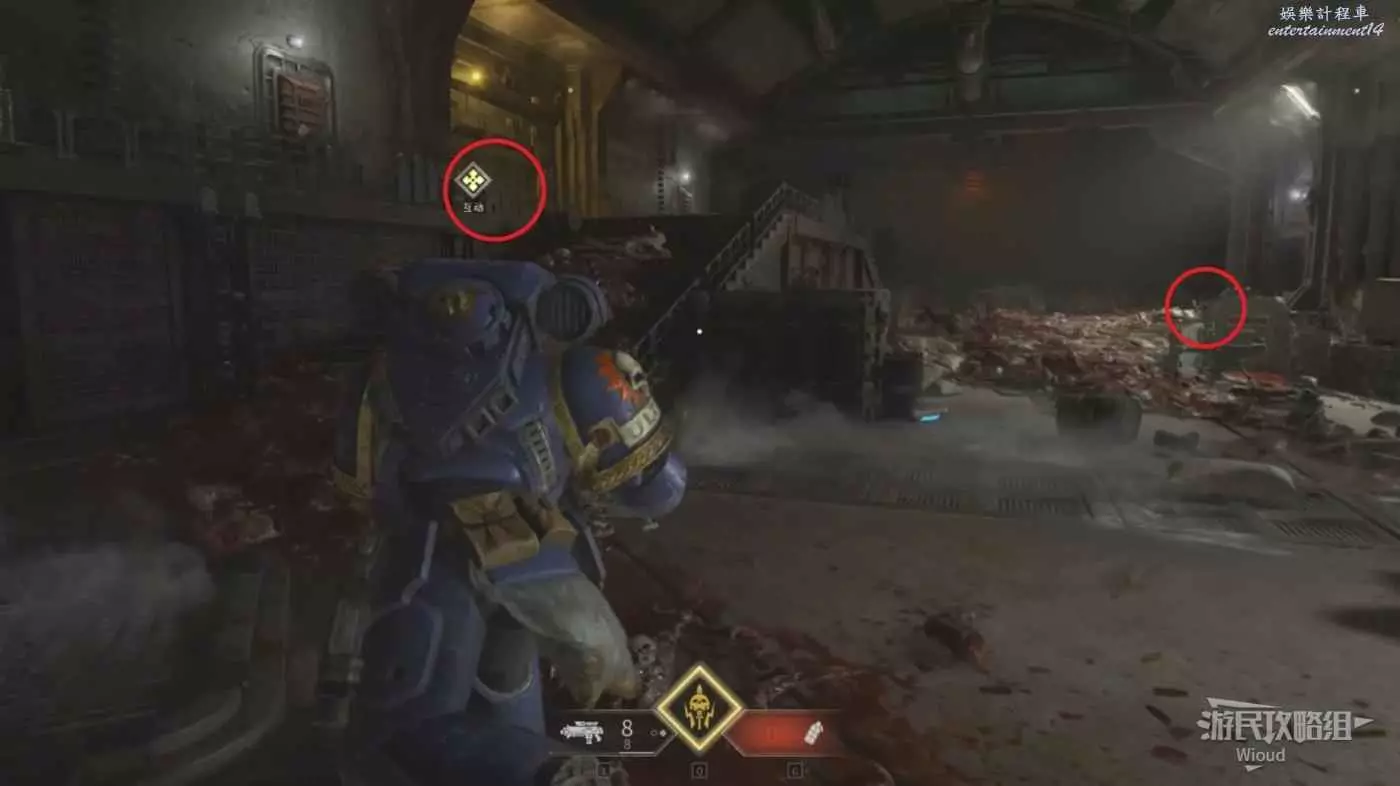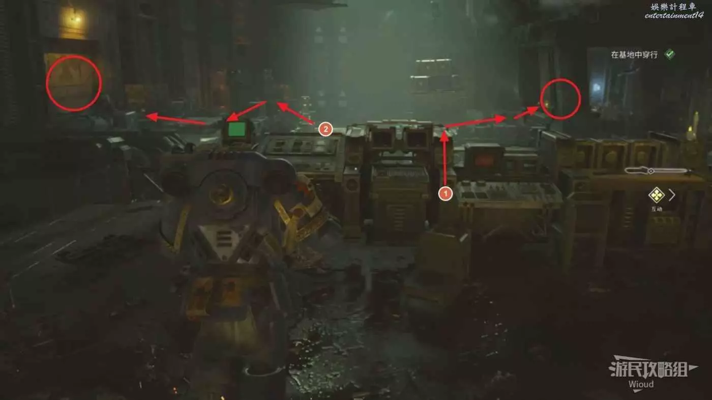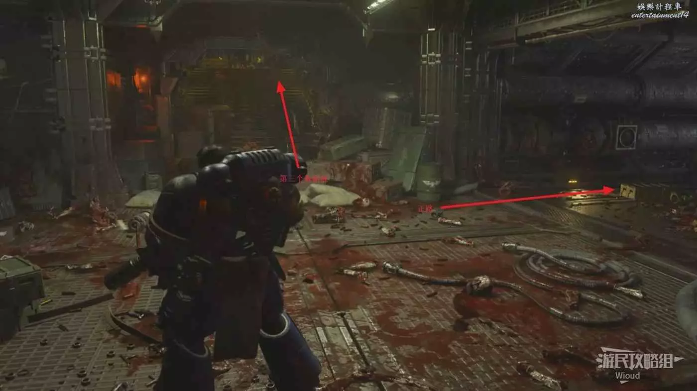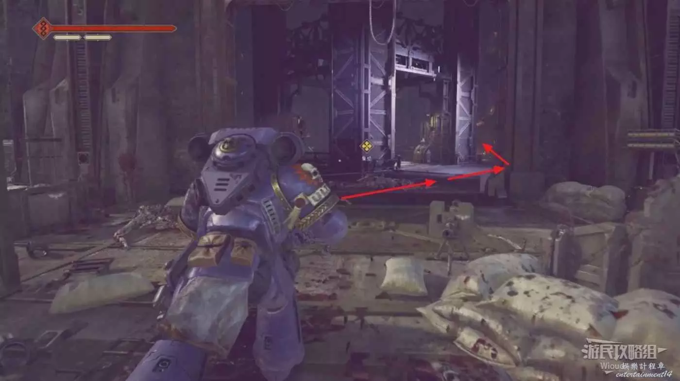 先不要乘坐電梯井上去,按照下圖路線走到電梯井右側,右側可以拿到本關最後一個資料板。