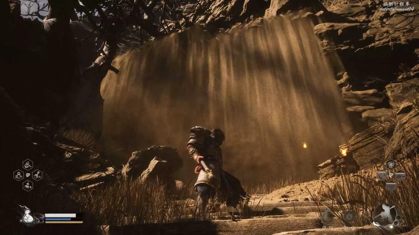 而《黑神話:悟空》選擇是海量空氣牆——誠然它也有好處,就是很多地形避免讓我摔死來節約時間,但是帶來的最大問題是“場景視覺引導”會讓我錯過很多地圖隱藏地點,比如沙瀑和瀑布後面的龍,我會自然地以為它只是空氣牆而已。
