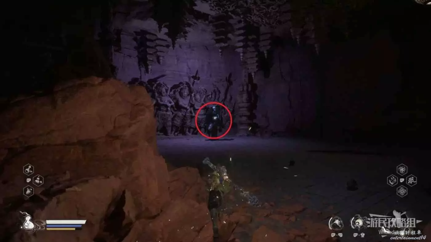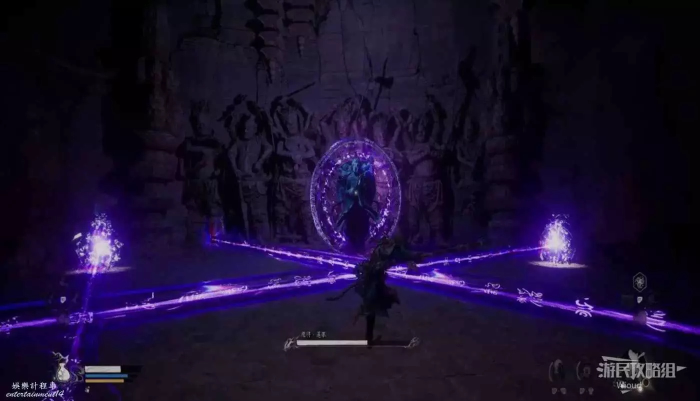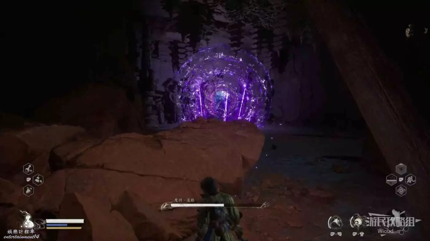 這時蓮眼會直接瞬移到後方中間的位置,後面還會出現紫色的法陣,我們直接跑到開始跳下來的位置,這裡有一塊能擋住我們的大石頭,在這裡待著都不用躲BOSS的技能。