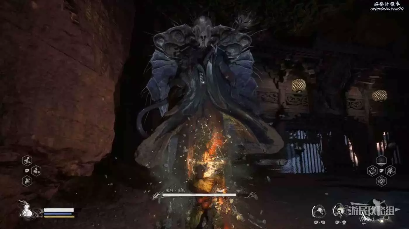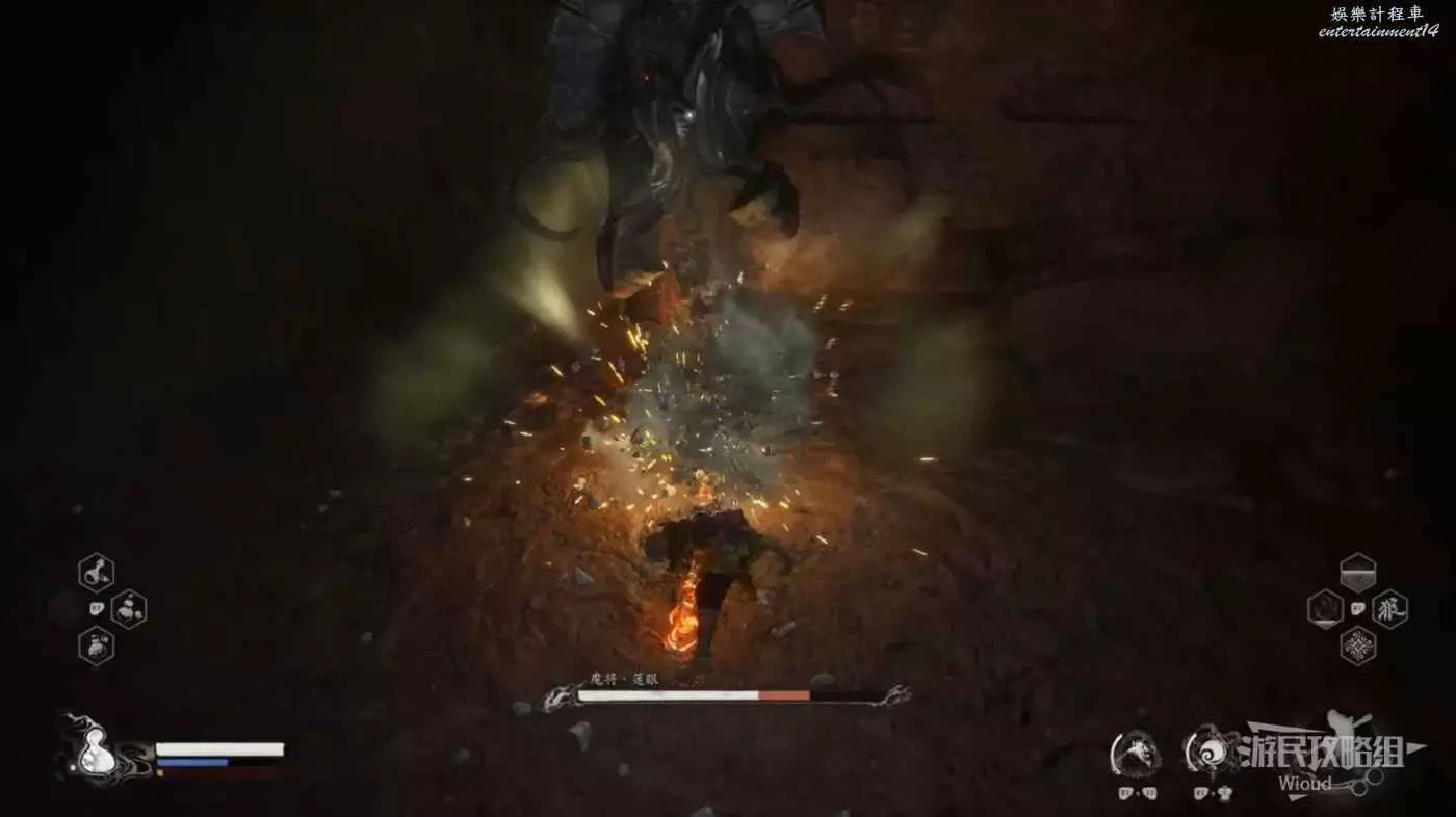 攢到四棍勢一個重擊敲下去,蓮眼的血條差不多只剩三分之一不到,這時要趕快跑到BOSS的身後。